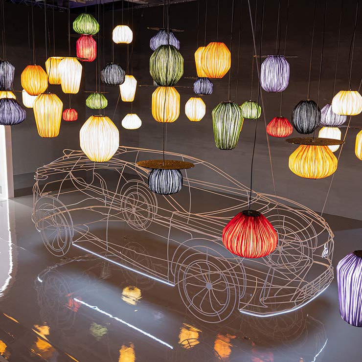 The RZ is illuminated by Aqua Creations’ Code 130° silk collection of colorful pendant lights, which add a material quality to the immersive installation reflecting Lexus’ vision for a carbon-neutral future becoming a reality. The installation will be accompanied by a lounge area featuring the new ToTeM lighting collection by Aqua Creations.