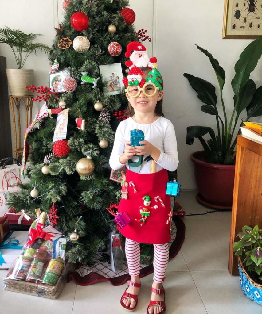 Dressed from head to toe with notice-me-red, the Andanars with Keli Teo pose in front of their majestic Christmas tree. The richness of the green color certainly stands out when contrasted with the decor in other colors. It only proves to be the perfect backdrop for this charming photo.
