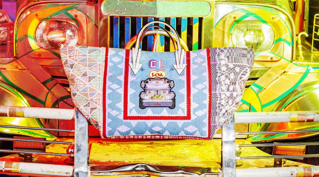 His denim blue and black satin Manilacabas are wildly colorful and delightful tapestries of our country. From Luzon he selected the traditional op-art Binakol textile woven in Ilocos, embroidered with the traditional barong florals that Lumban, Quezon specializes in. The Visayas is represented by the checkered patadyong from Iloilo City, while Mindanao makes a statement with the diamond geometrics of our Yakan peoples and abaca t’nalak by our B’laan peoples. The central motif of the bag is our unique festive jeepney, framed by mother-of-pearl beads influenced by the T’boli costume.