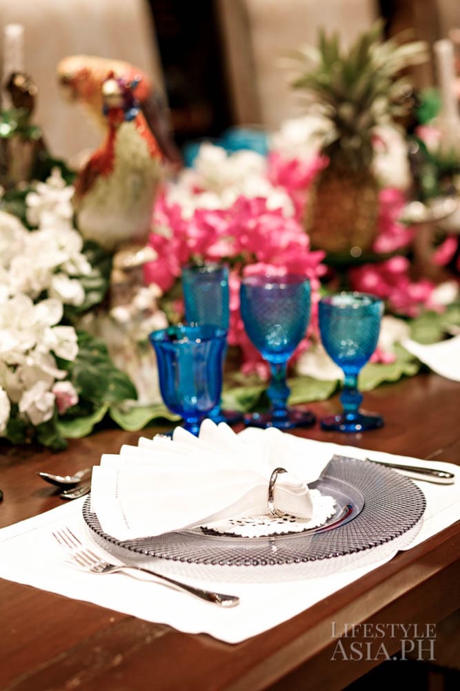 Angie’s tablescapes are colorful with blooms from their garden spread out to resemble a tropical garden. Ceramics from her mother’s collection of porcelain in the form of parrots and monkeys add quirk to her table. Flatware is selected from a large selection in their family’s china cabinet to suit a theme that had organically developed to become part Cuban, part tropical. Good friend Ferdie Salvador who Angie trusts to help deck her table explains, “We had all these beautiful bougainvillea from their garden and other tropical flowers so we decided to create an arrangement that was lush and tropical. This all happened as we were putting together the set up.” The addition of her mother, Edna’s, ceramic and porcelain and dark wood throughout the Lhuilier’s Cebu residence hinted at old world elegance.