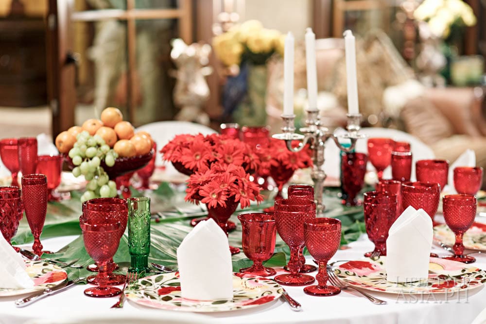 “I love color but not really from flowers but from my collections like Portugese cut vessels and chargers,” explains Angie. Vidro, a glassware brand from Portugal that Angie had just recently brought into the country, is a highlight in her recent parties. The deep color and intricate patterns carved on glassware using centuries-old Portugese techniques add color to her set ups. Angie’s choice of stemware, cutlery, porcelain and ceramics reflect her personality when entertaining. “I always choose pieces with history so my guests can converse about them. I love the stories behind them.”