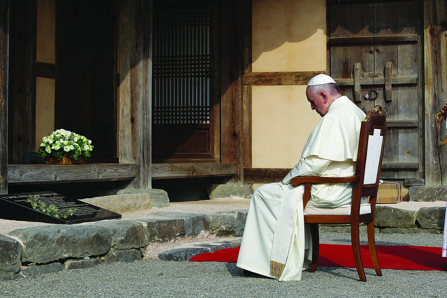 Pope Francis prays at the birth place of St. Andrew Kim Taegon, who was the first Korean-born Catholic priest and is the patron saint of Korea at the Shrine of Solme Dangjin, South Korea