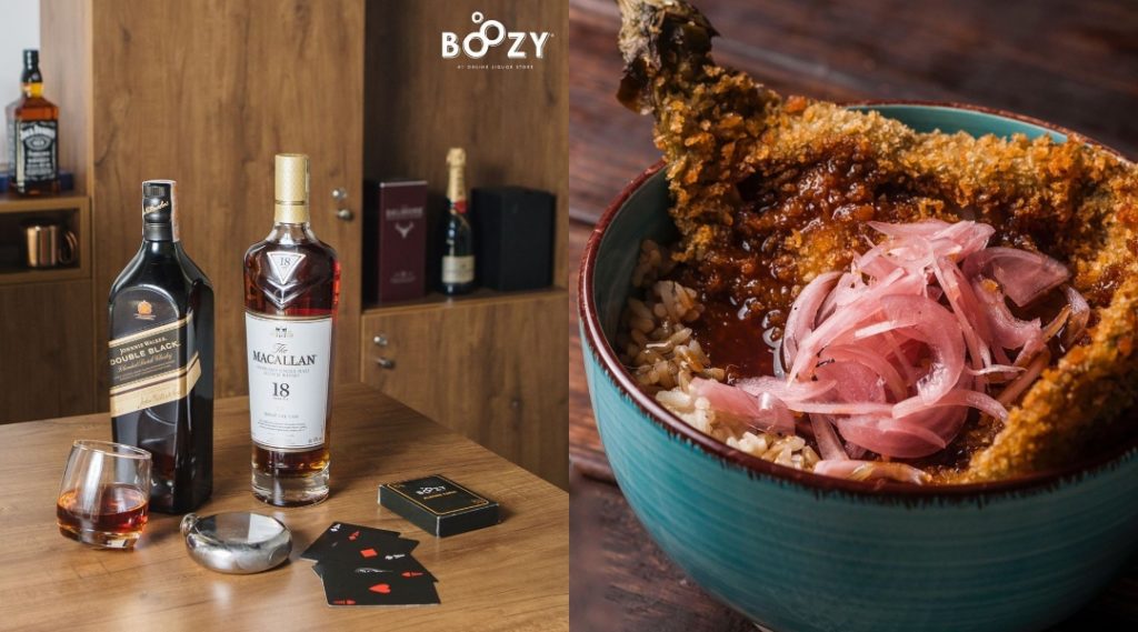 LEFT: Liquor available to order from Boozy. RIGHT: “I Am Loved” Eggplant Katsudon bowl from CloudEats. (Photos from Boozy and CloudEats)