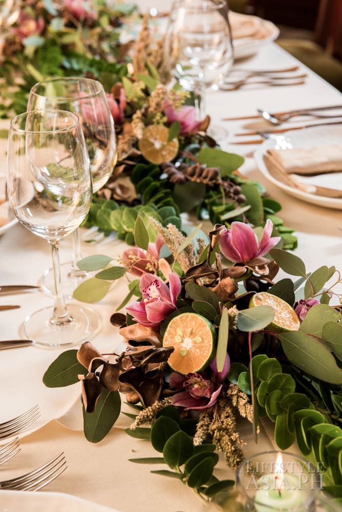 A garland of eucalyptus, dalandan and flowers makes for a sumptuous tablescape