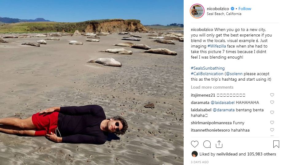 Nico Bolzico showed his sense of humor by mimicking the “locals” at Seal Beach in California.