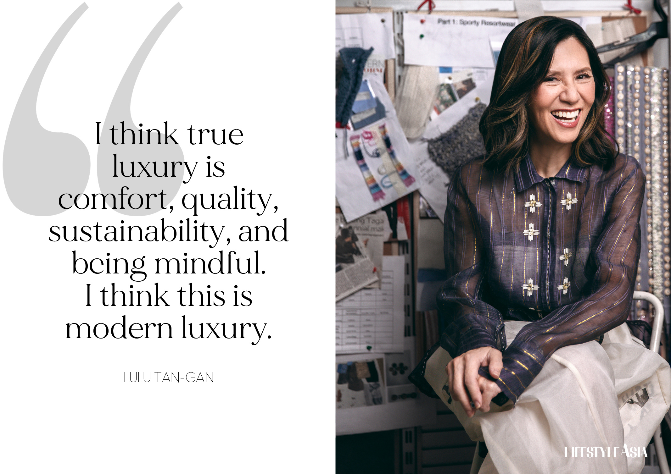 With the Red Charity Gala just around the corner, a visit to the Tan-Gan atelier reveals a space percolating with creativity. It is here where Lulu Tan-Gan is being photographed for the Lifestyle Asia cover amidst swathes of piña fabric, herself the perfect muse to the meticulously crafted ensembles she creates. Out of frame, her staff continue on their tasks, sewing garments surrounded by racks of toiles and the brand’s archival pieces. Somewhere, Lulu’s daughter Jessica is taking behind-the-scenes videos, while hyping her mom as the designer moves gently through various poses.
