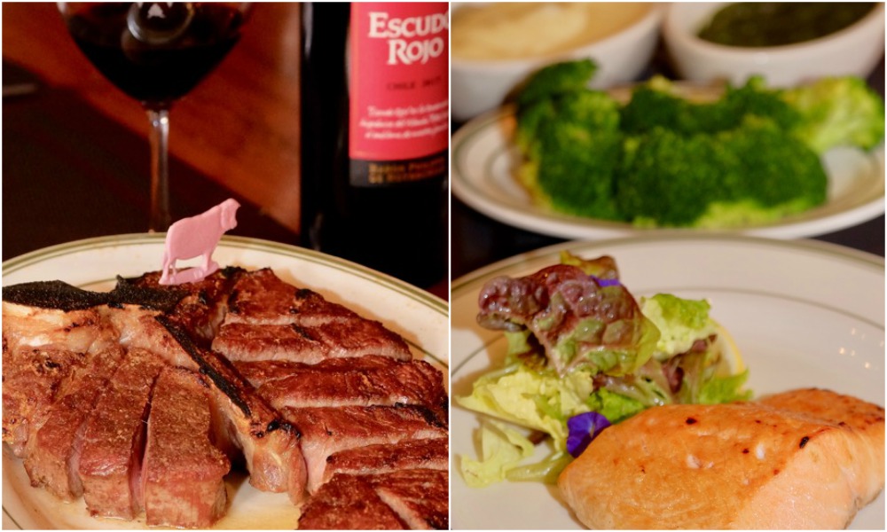LEFT: USDA Prime Dry-Aged Porter House Steak. RIGHT: Grilled Salmon. (Photographed by Miguel Abesamis)