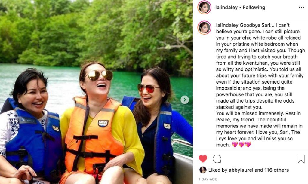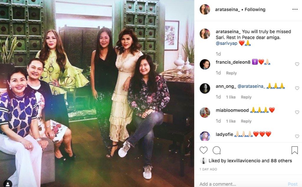On Monday this week, One Mega Group Founder Sari Yap has passed. Yet we will always remember her as the exceptional woman whose commitment to her vision is a true inspiration. From making an impact on the lifestyles of people to sharing insights on topics that matter, Sari is a true source of encouragement. Society figures like Linda Ley and Sheila Romero know this well, and on the day of her passing, they shared wonderful moments spent with their good friend Sari coupled with a heartwarming message. We have compiled some of the noteworthy insights of Sari together with society’s Instagram posts dedicated to her.