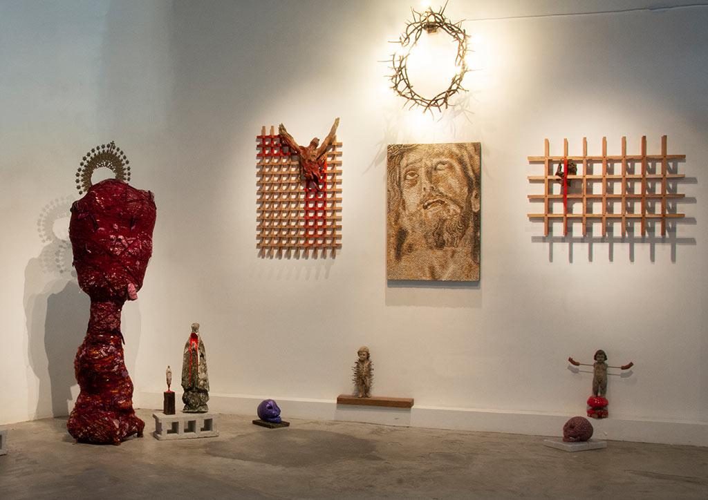 In the same space, soft sculptures beside an image of a female nude dismantle sexual taboos. All the while, viewers will find fragile figurines randomly positioned around the gallery, to serve as reminders of the doubts that weave in and out of our spiritual consciousness.