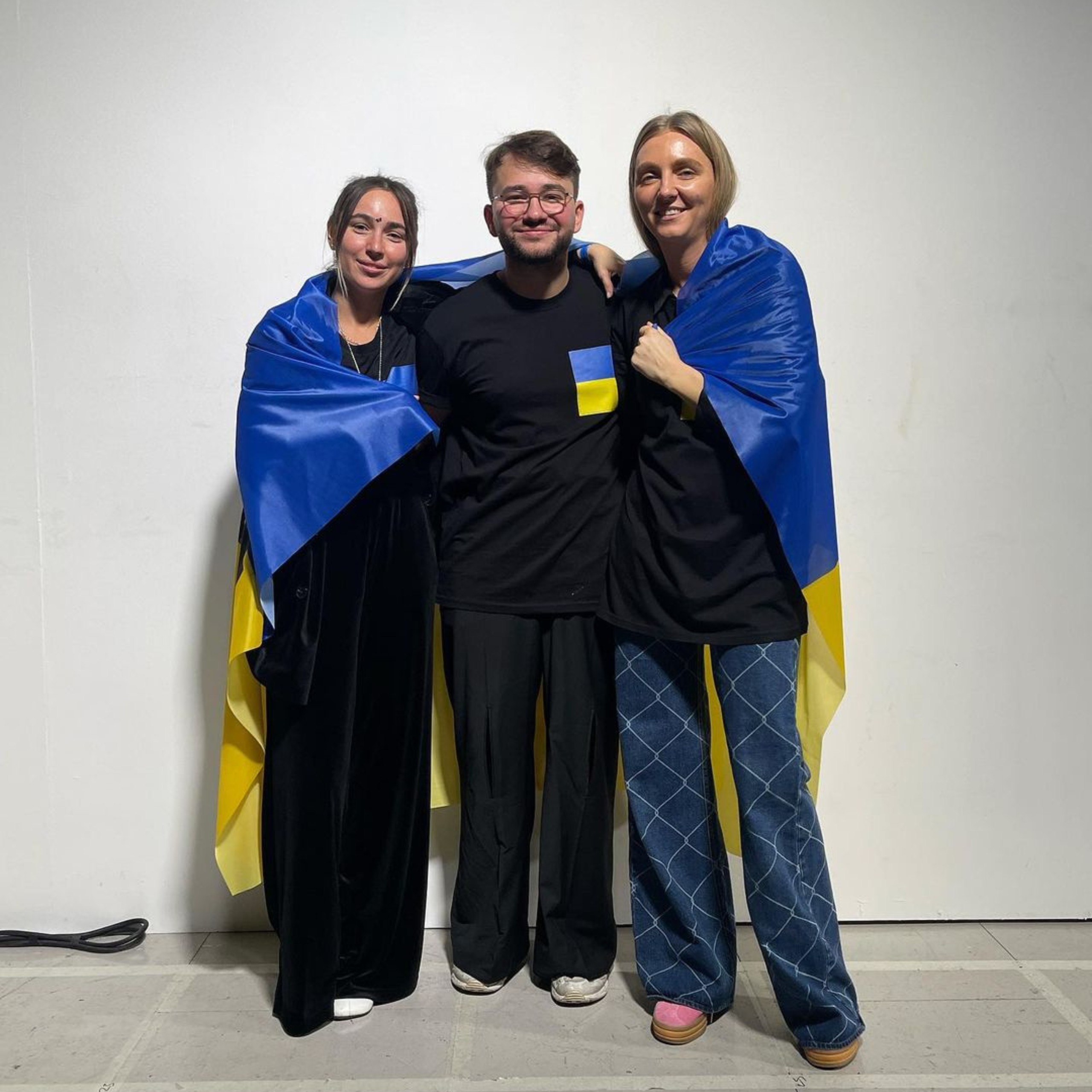 At the end of the show, the three designers walked on the runway carrying a Ukrainian flag. The flag bore the UNITED24 logo, the fundraising campaign launched by President Volodymyr Zelensky.