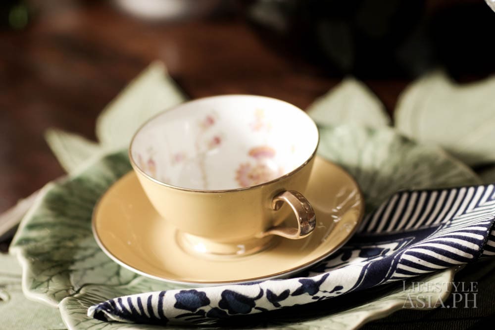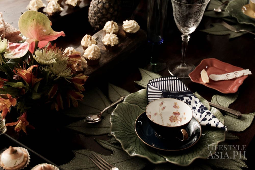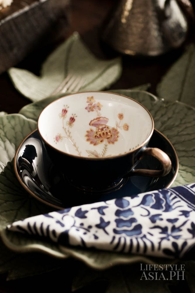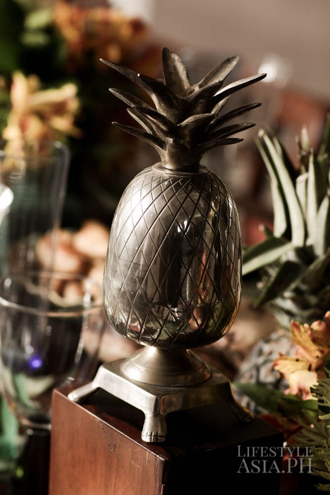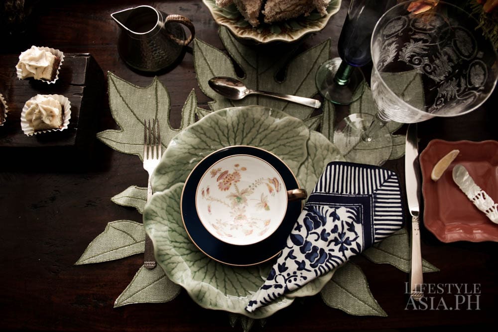 Her tastes tend to run on items full of texture. “I have a weakness for celadon, old blue and whites and locally embroidered linen countered by something vibrant like colorful lacquerware from Myanmar,” she says. She also likes the look of succulents. “We are big on using leaves more than flowers, like celum or philodendron in large quantities around the dining area.” For a hint of wit, she likes adding the unexpected, like a small animal figurine, “just to throw things off.”
