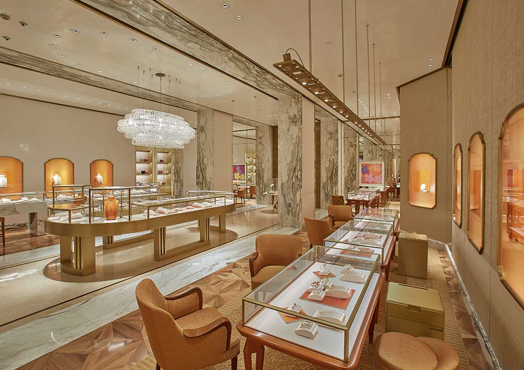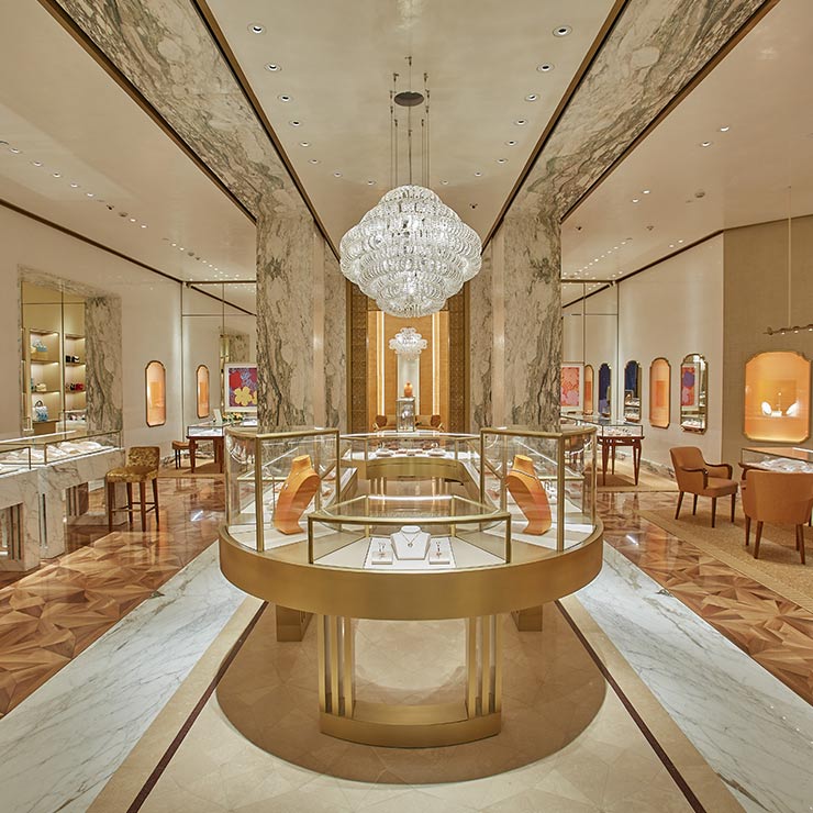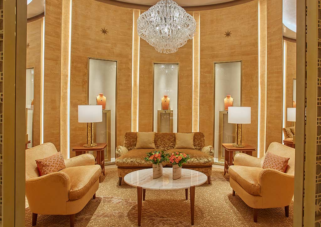 The boutique’s oval-shaped counter with light galvanized iron inspired by the Italian architect Carlo Scarpa is an enticing invitation to explore, discover, and shop. At the center of the store is a crystal chandelier that adds decadence to the jewelry on display while highlighting the warm and rich palette of the store.