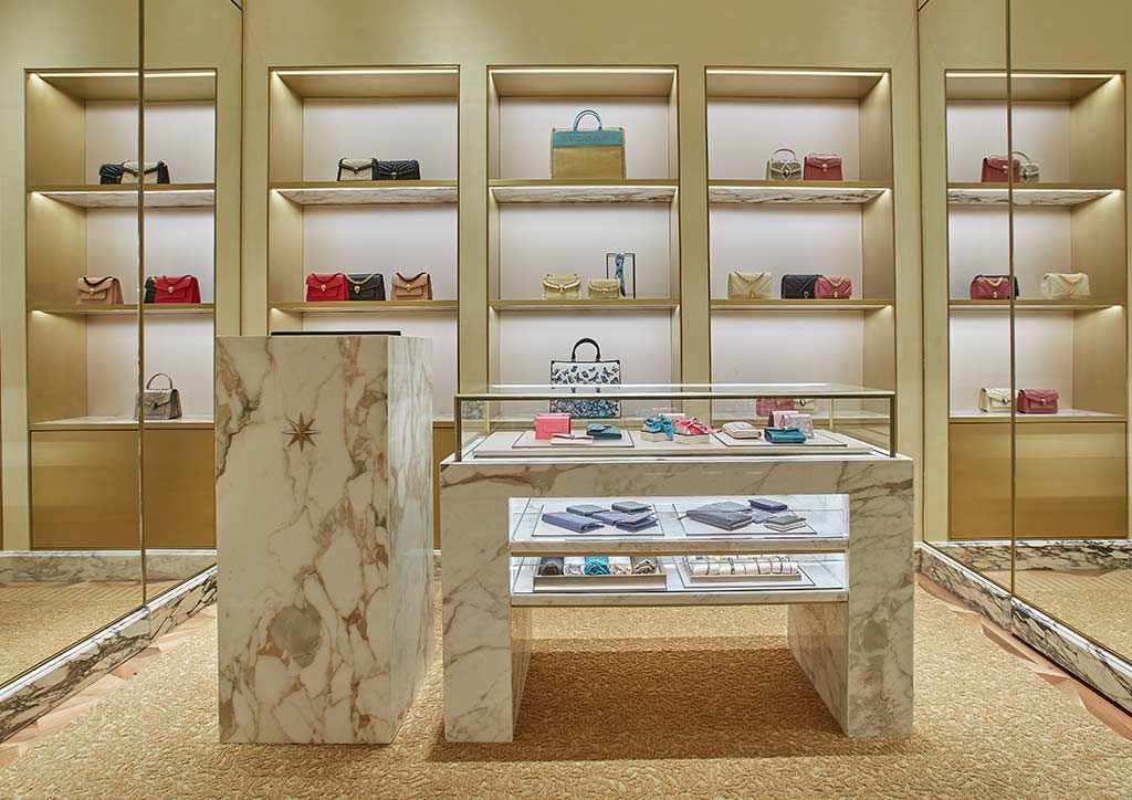 The Italian house’s Via Condotti eight-pointed star greets guests as they enter the 198-square meter shop.