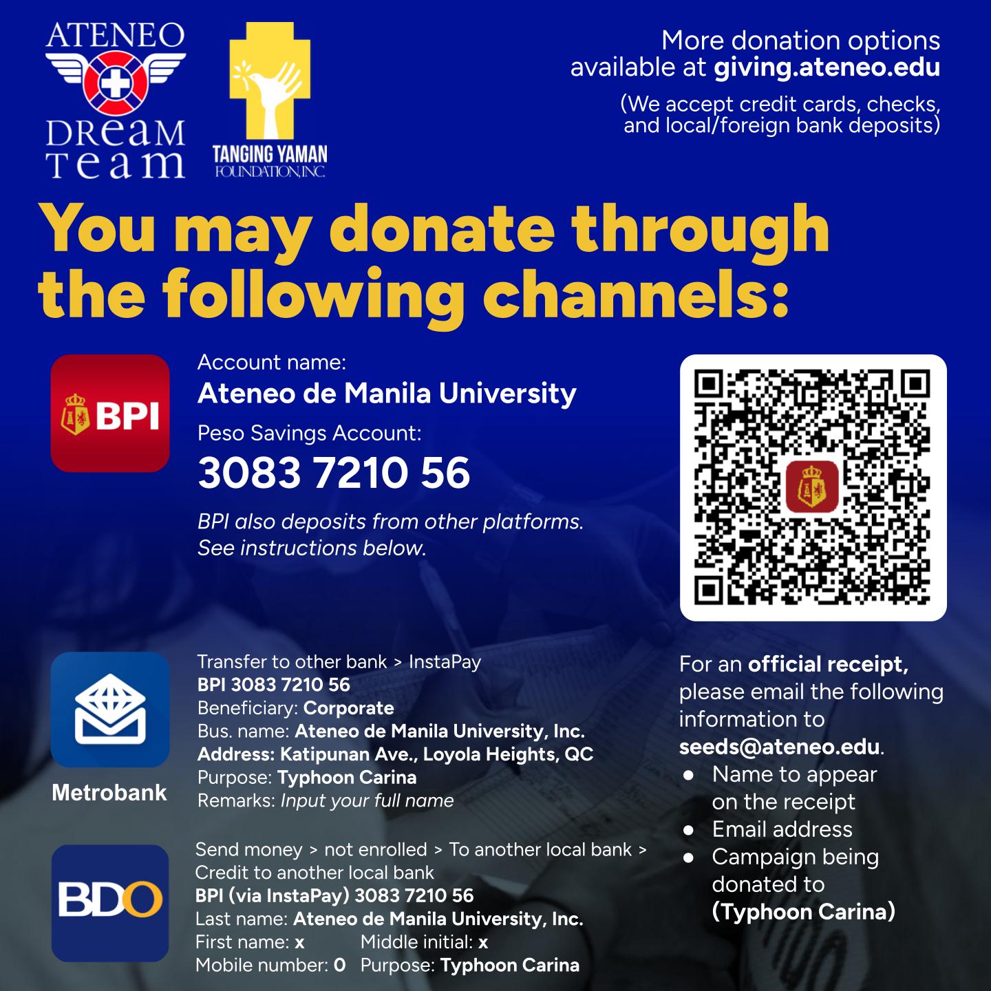 Ateneo de Manila University’s Disaster Response and Management (DReaM) Team, in partnership with Tanging Yaman Foundation, Inc., is calling for cash donations for those affected by typhoon Carina. Contributions will help them provide food, water, and other immediate needs to severely affected communities.