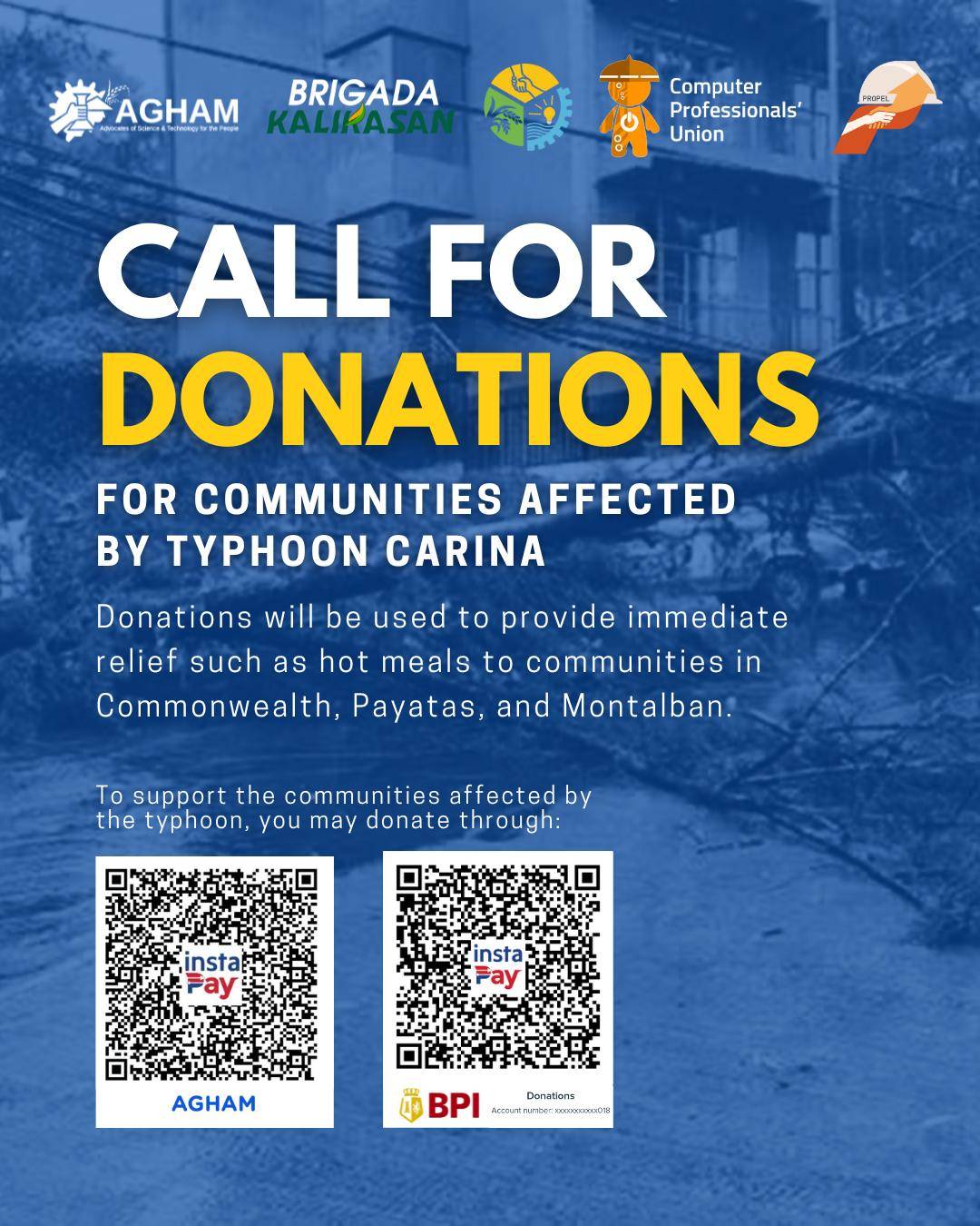 AGHAM (a national organization of professionals and educators in STEM), along with Brigada Kalikasan and Science and Technology Network for People’s Development, has opened a donation drive for communities in Commonwealth, Payatas, and Montalban. This will cover immediate relief efforts such as serving hot meals to the affected.