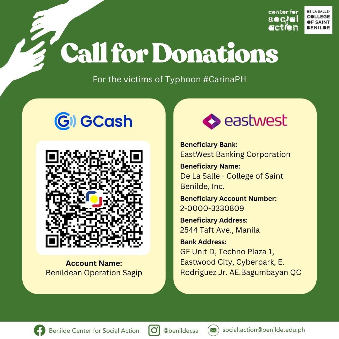 De La Salle-College of Saint Benilde’s Center for Social Action is calling for cash donations to help families and communities affected by the typhoon. The group will be giving the donations to its Kapitbahayan Partners in Manila and Pasay. To ensure proper tracking, the organization is asking donors to email a copy of their proof of donation to [email protected].