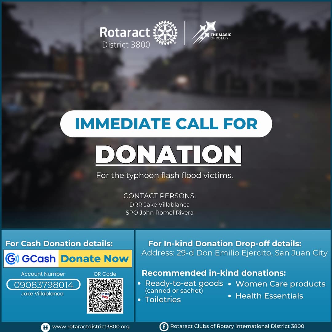 The Rotaract Clubs of Rotary International District 3800 have also opened a donation drive for typhoon flash flood victims. The group accepts both monetary and in-kind donations.