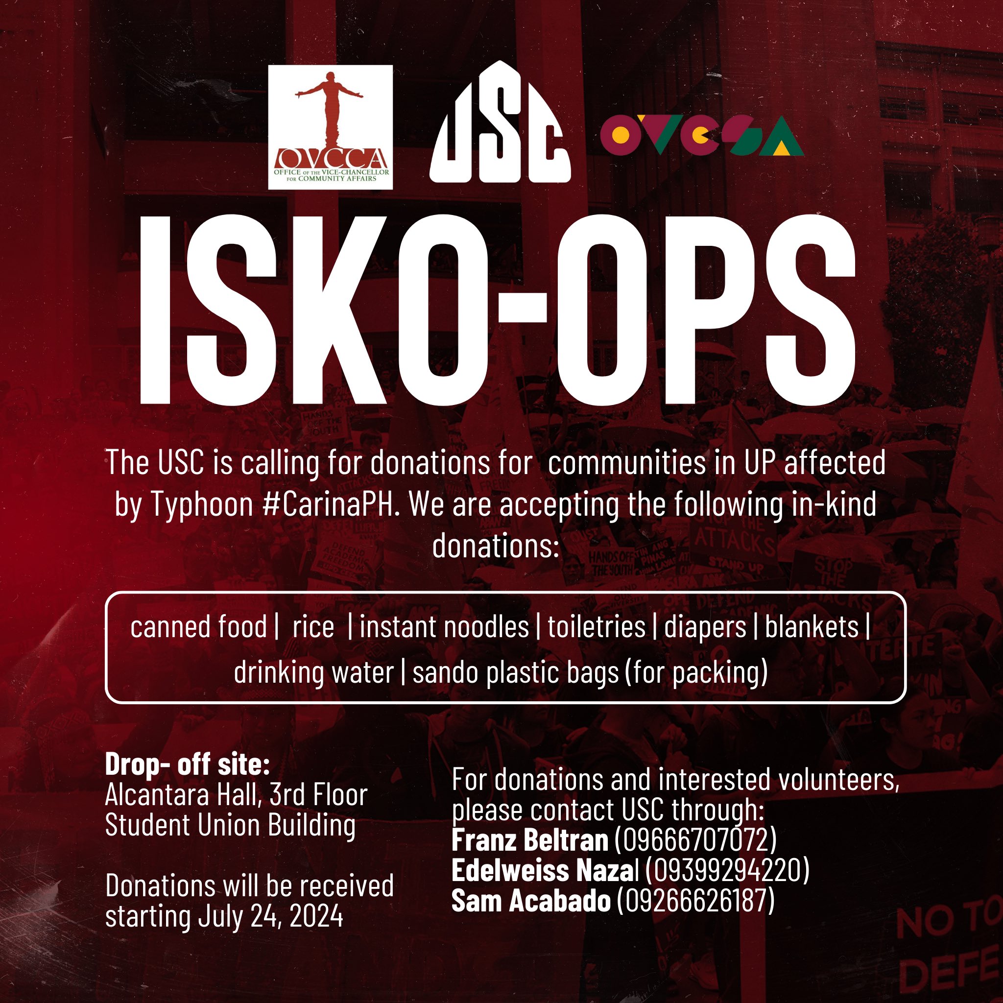 The UP Diliman University Student Council has organized its IskoOps, a relief drive for families and communities affected by typhoon Carina. The group is accepted both in-kind (eg. canned food, drinking water, toiletries, diapers, blankets, rice, instant noodles) and monetary donations for relief efforts.