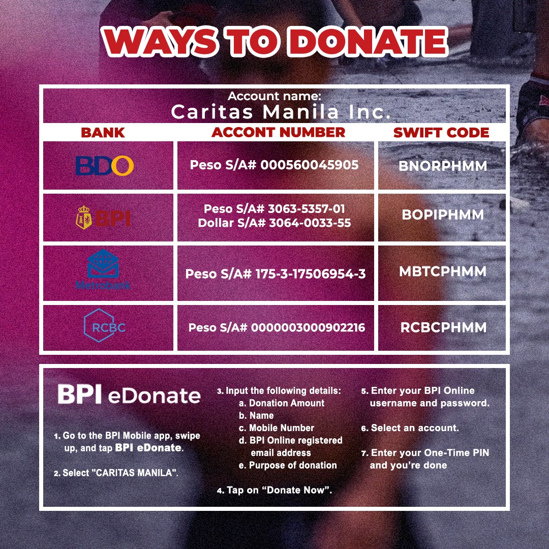 The Catholic Church in the Philippines’ NGO Caritas Manila is calling for cash donations to help families affected by the typhoon. They also ask donors to send a copy of their deposit slip to their Viber (09298343857), messenger (Caritas Manila), and email ([email protected]). The organization also accepts cash donations from abroad via Myriad USA.
