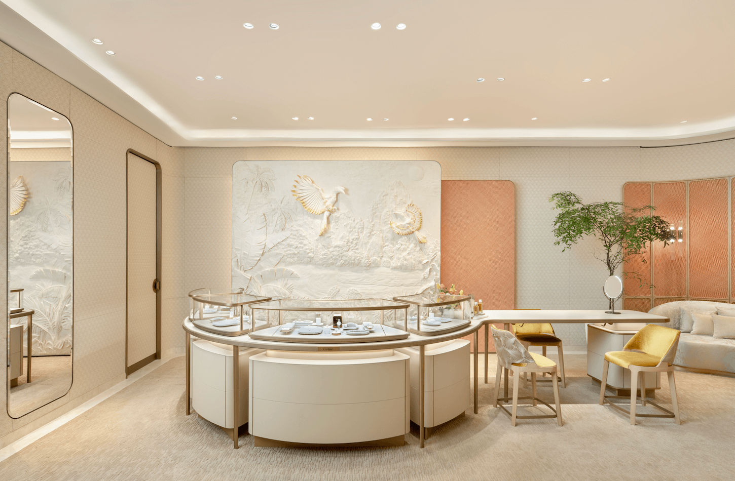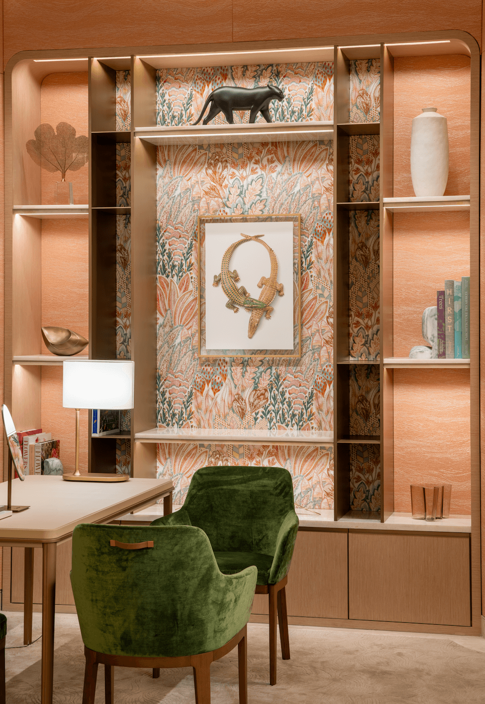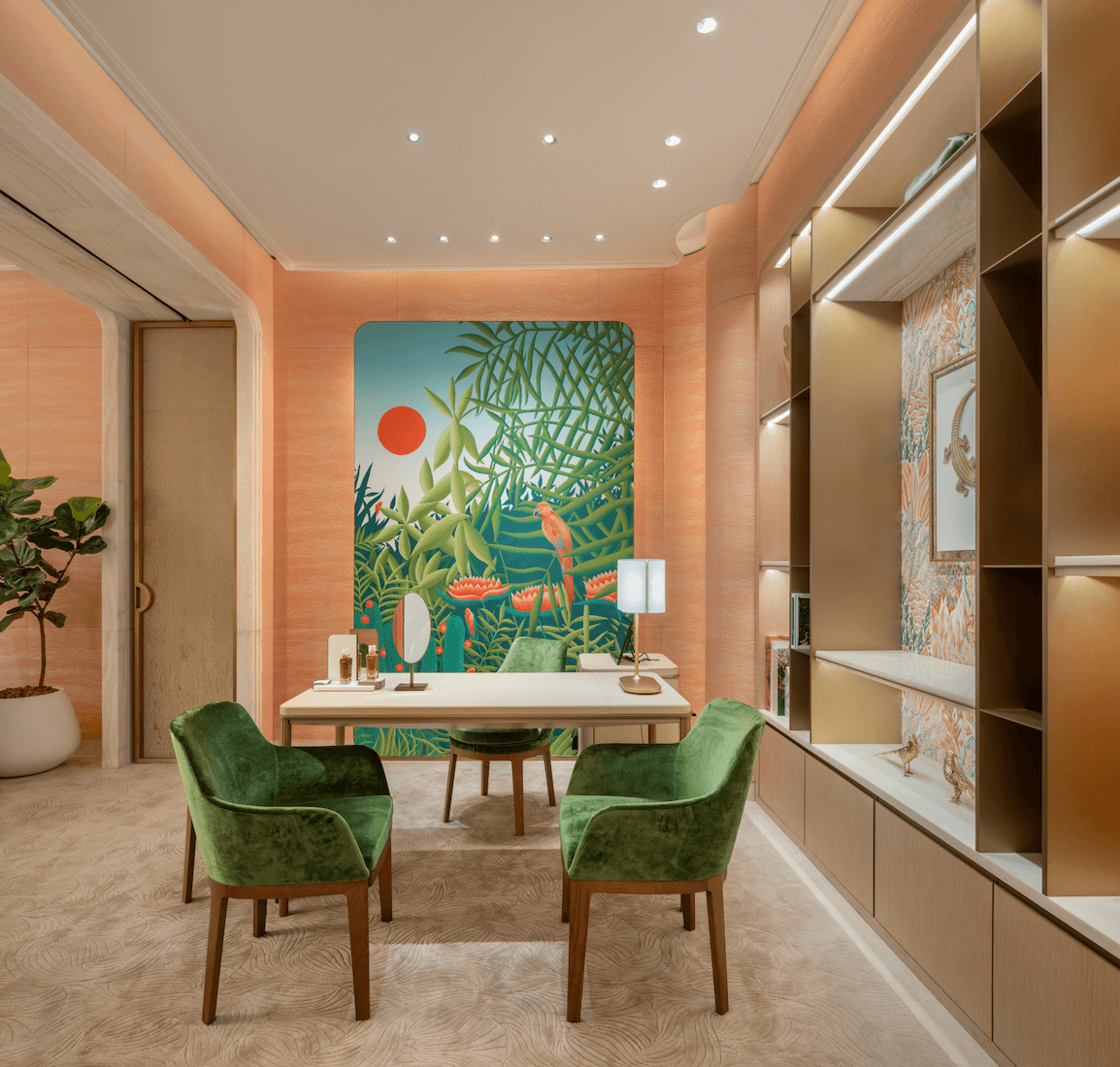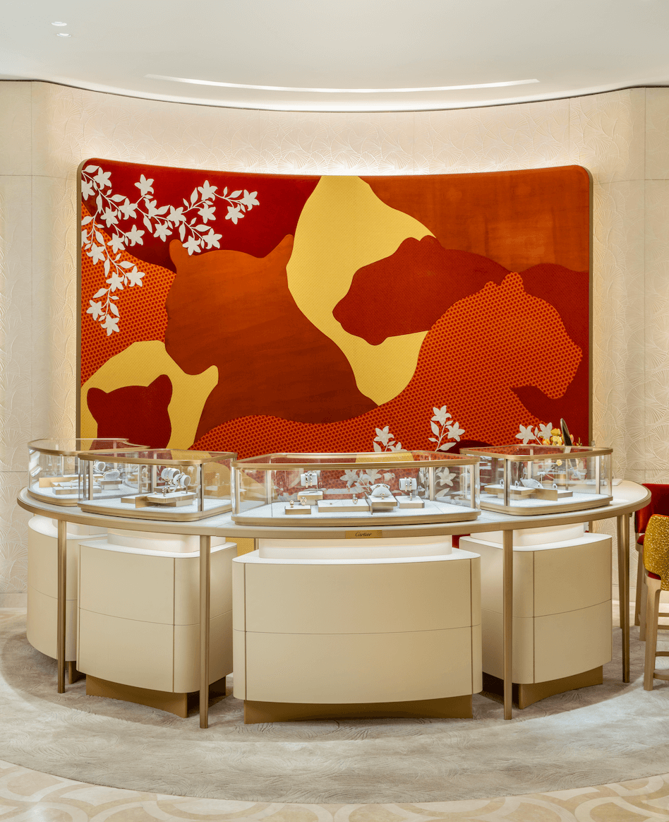 A striking patchwork effect adorns the feature wall, portraying the majestic panther, Cartier’s emblem, surrounded by vibrant flora, an ode to the Philippines’ national flower, the Sampaguita.