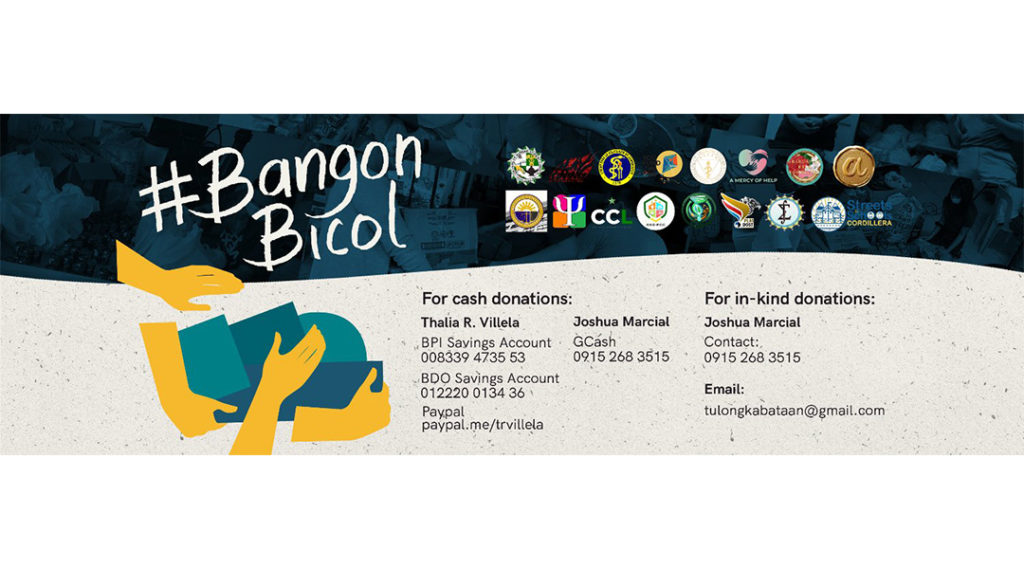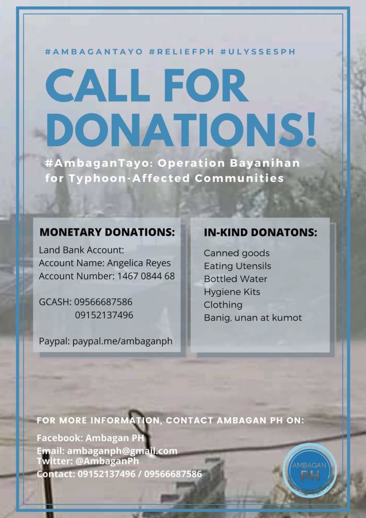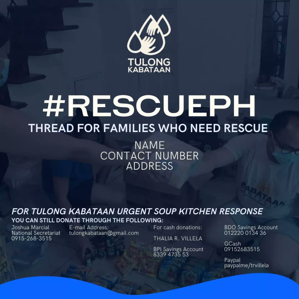 With many families currently stranded and need rescuing due to typhoon Ulysses, this network of various youth organizations is helping connect volunteers to conduct rescue operations. They have an ongoing Twitter thread where you can help locate individuals and families who need rescuing. The network is also currently preparing soup kitchens in Metro Manila where most families are in immediate need of food, warmth, and shelter. You may also donate through their cash and in-kind donation channels for their ongoing aid to those affected by typhoon Rolly.