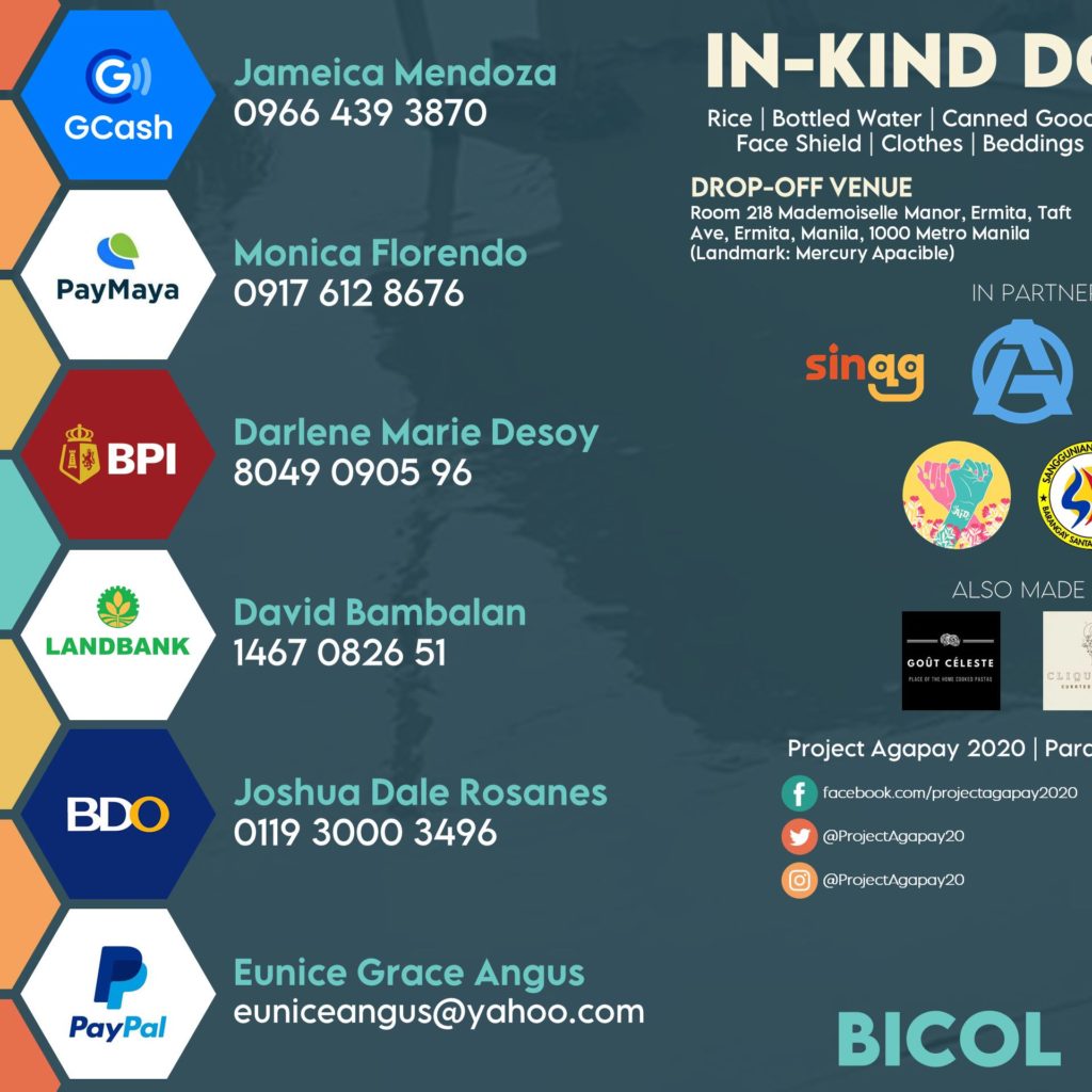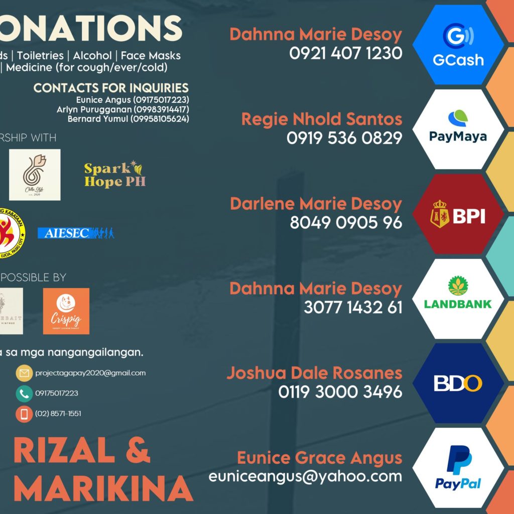 Bicol, Marikina, Rizal, and Cagayan were among those hard-hit by the typhoon. Project Agapay targets their beneficiaries here. Through cash donations and in-kind donations, the youth-led initiative deploys teams to hand in basic essentials like toiletries, canned goods, rice, bottled water, beddings, and medicines for the victims in the four areas.