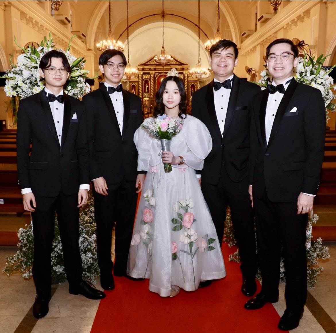 Twenty-five years ago, the then-young bride wore a traditional white gown with embroidery and lace by Ben Farrales who had also designed the groom’s elegant Barong Tagalog for the wedding. Fast forward to their silver wedding anniversary when Czarina donned a blush pink creation by Steve de Leon, paired with a cameo encrusted tiara designed by her brother, Jun Jun Ablaza. The couple was joined by their five children: Azia, Alfonso, Agu, Azi, and Amanu.