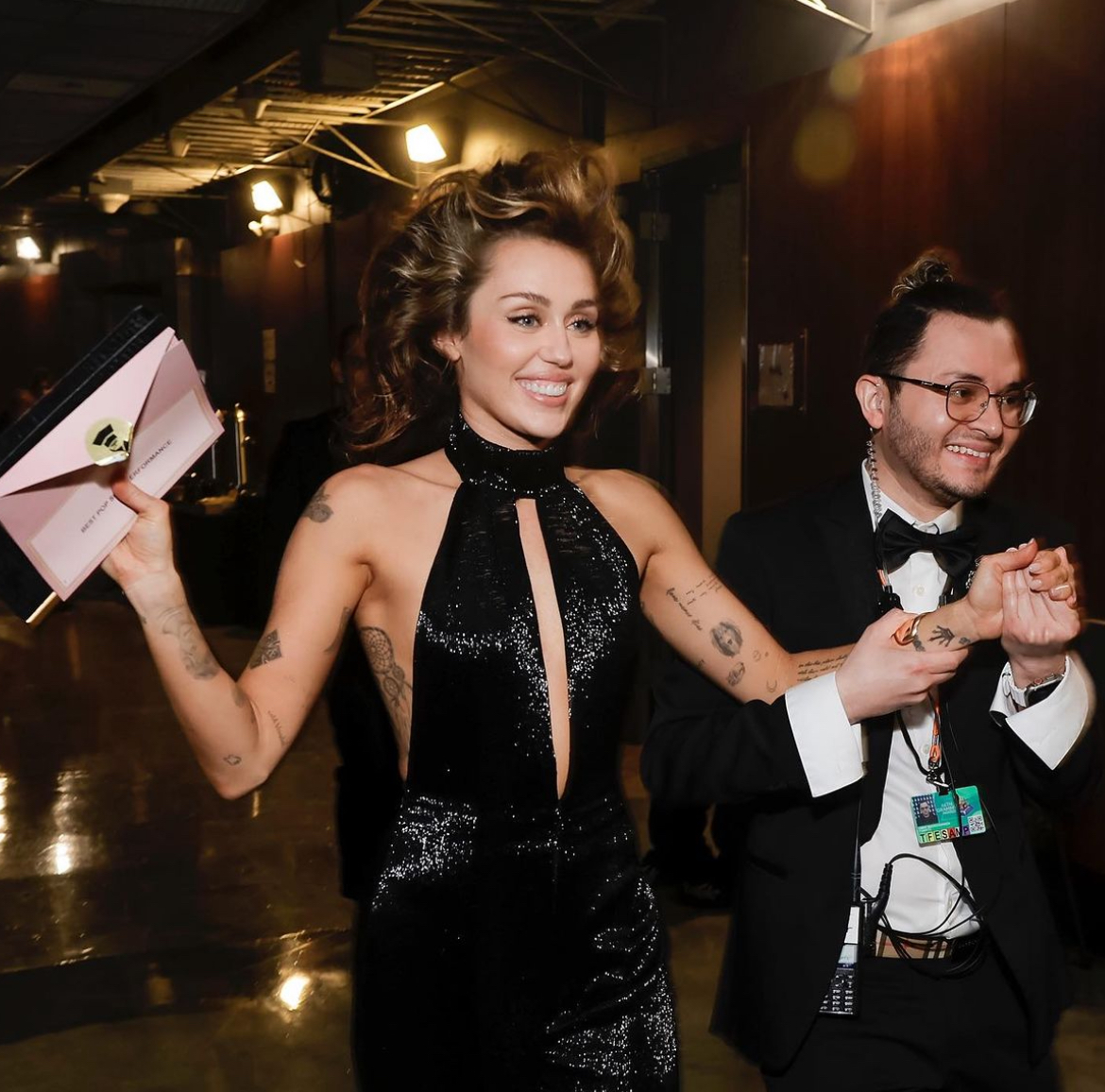 Miley Cyrus celebrated her first-ever Grammy wins, securing Record of the Year and Best Pop Solo Performance for “Flowers.”
