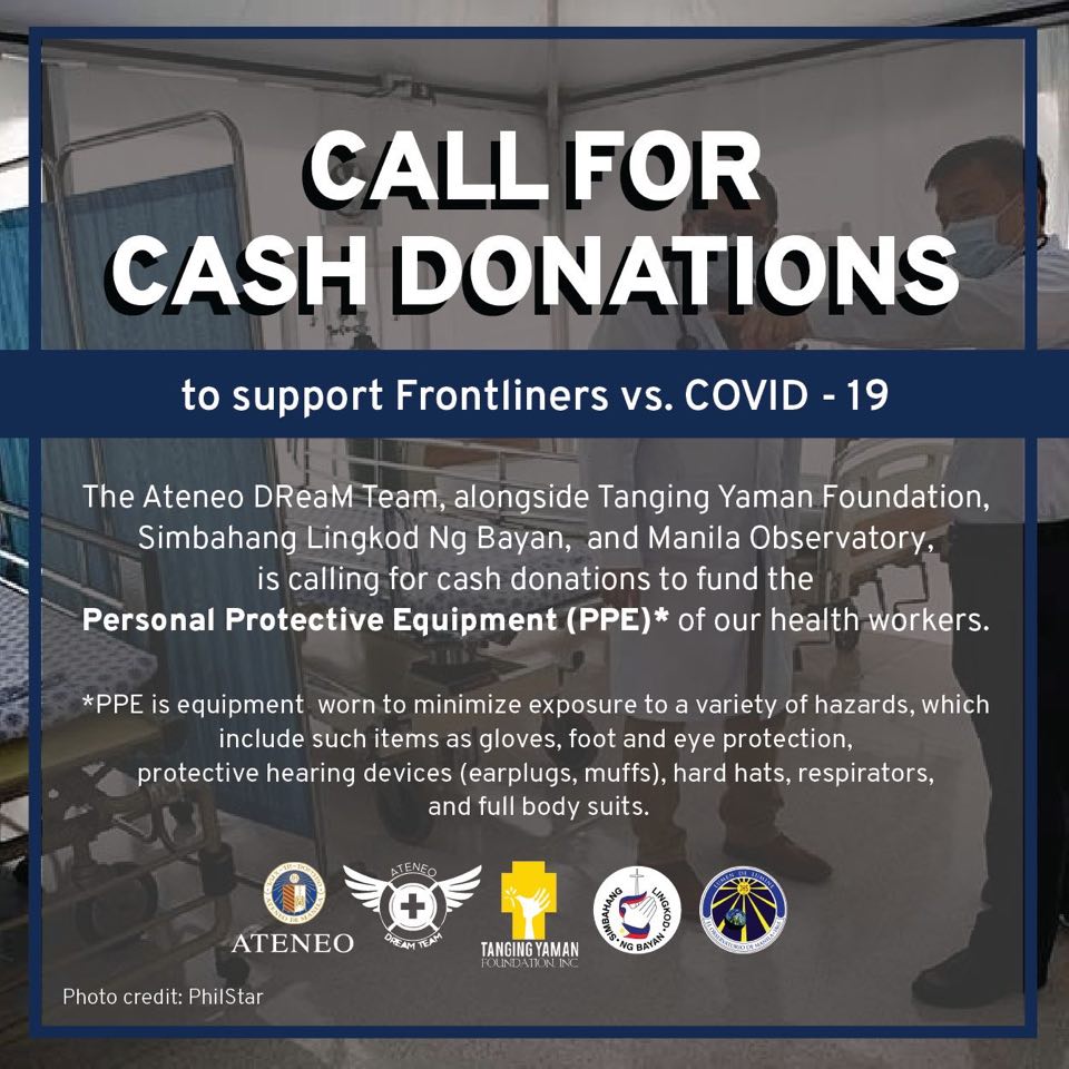 Ateneo de Manila University’s Disaster Response and Management team, in partnership with Tanging Yaman Foundation, Simbahang Lingkod ng Bayan, and the Manila Observatory, is calling for cash donations to fund PPEs for their health workers.