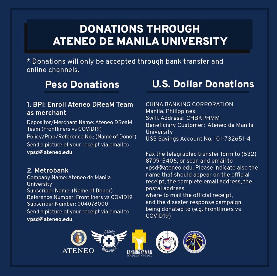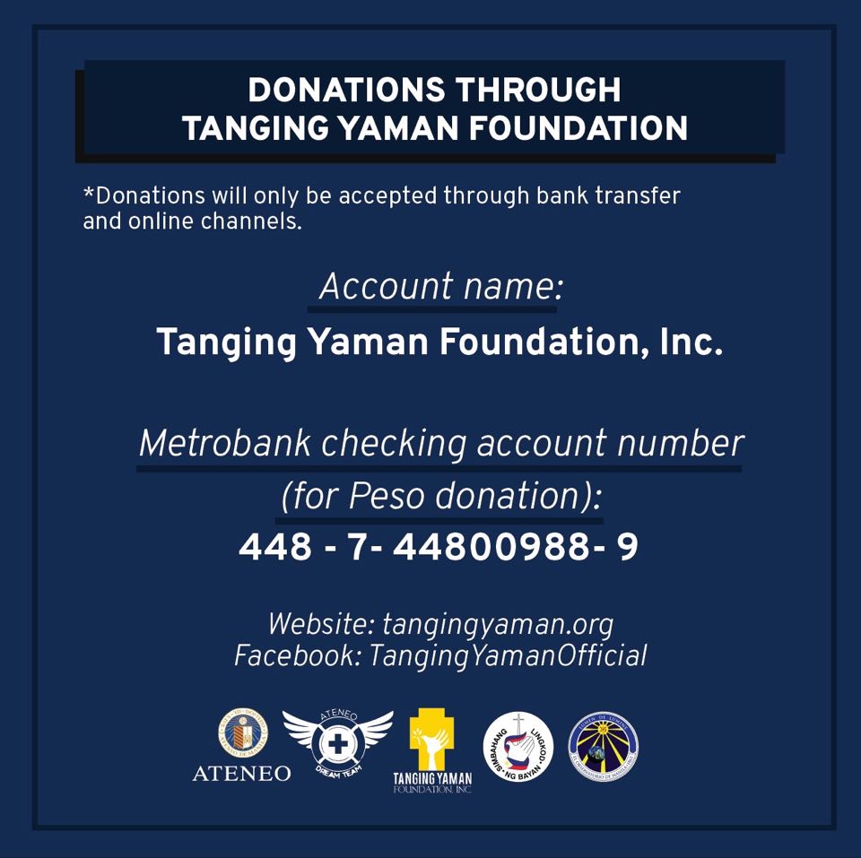 For monetary donations, deposits or bank transfers are accepted via Bank of the Philippine Islands (BPI).