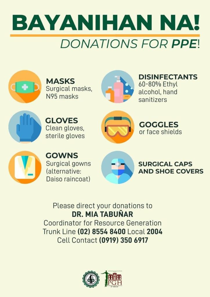 The state-owned hospital is open to donations of personal protective equipment (PPEs) and ethyl alcohol. Specifically, PPEs include surgical masks, N95 Masks, face shields, surgical gowns, among others.