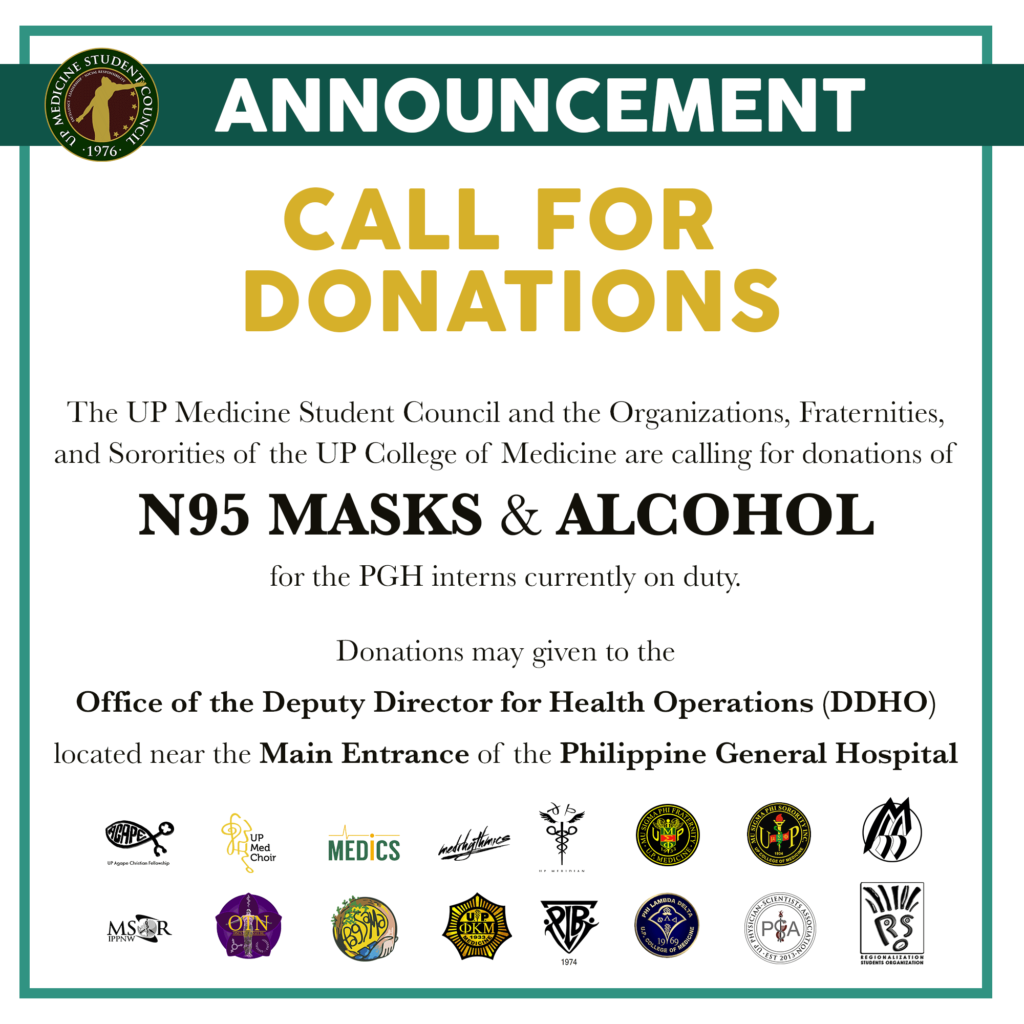 The combined forces of the UP Manila University Student Council, the UP Medicine Student Council, and other student organizations are calling for donations of N95 masks and alcohol for the use of on-duty interns at the Philippine General Hospital (PGH). Donations may be addressed to the Office of the Deputy Director for Health Operations.