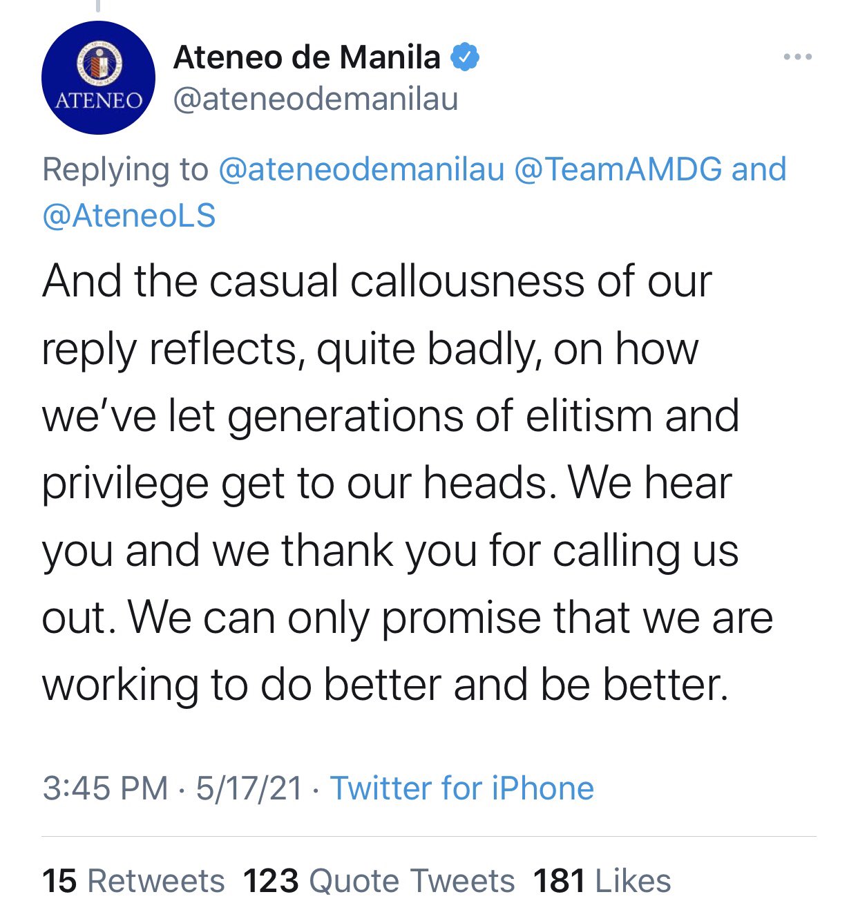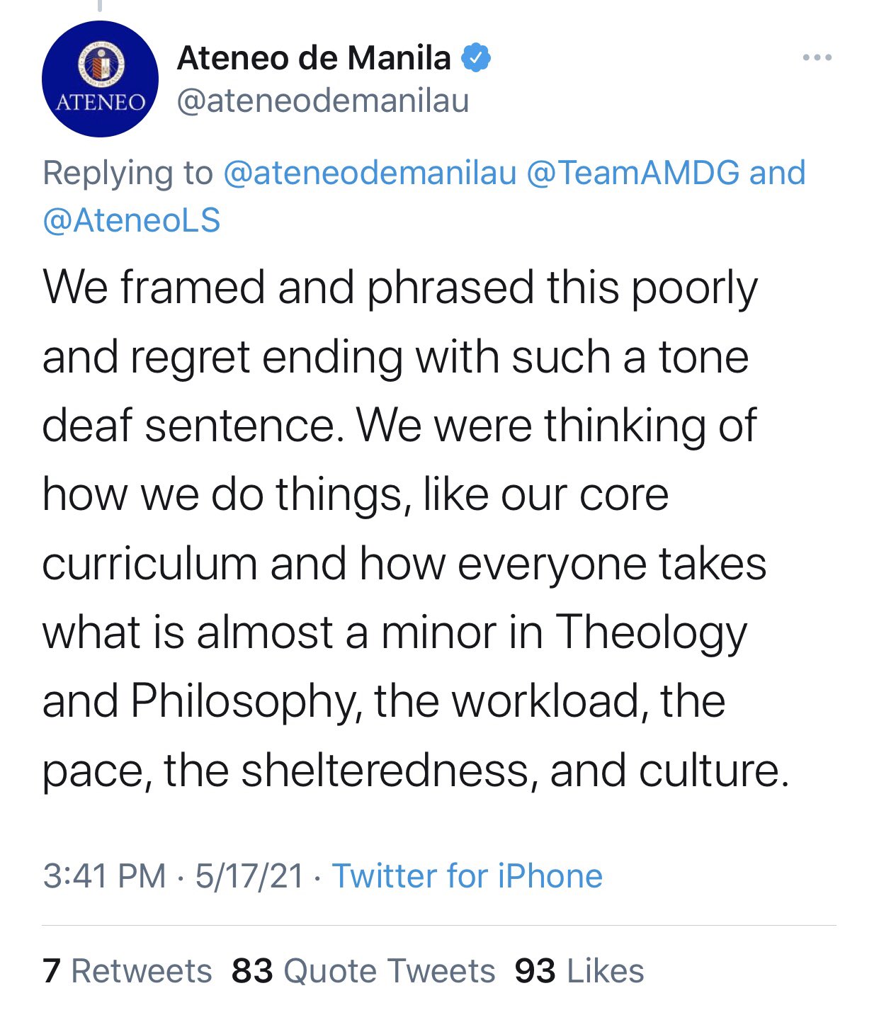 Perhaps, this is related to what Ateneo cited in its apology, “We were thinking of how we do things, like our core curriculum and how everyone takes what is almost a minor in Theology and Philosophy, the workload, the pace, the shelteredness, and culture.”