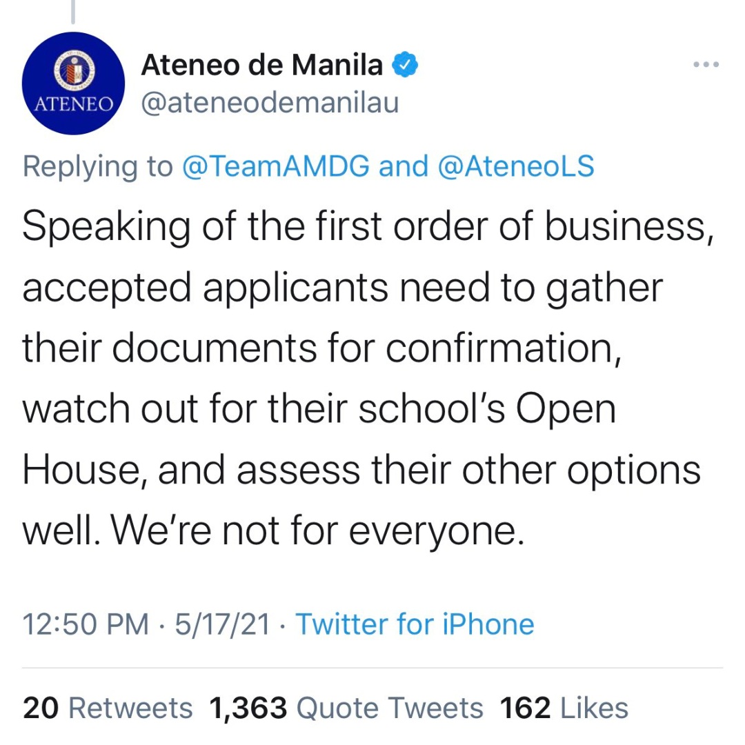 “We’re not for everyone,” says the official Twitter account of the Ateneo de Manila University last May 17 this year. The tweet was a reply to the Team AMDG’s post welcoming the freshmen of the school year 2021. The university issued a public apology and the viral tweet has been deleted. Yet social media remains abuzz with the striking statement, provoking discussions on the elitism and privilege Ateneo has long been associated with.