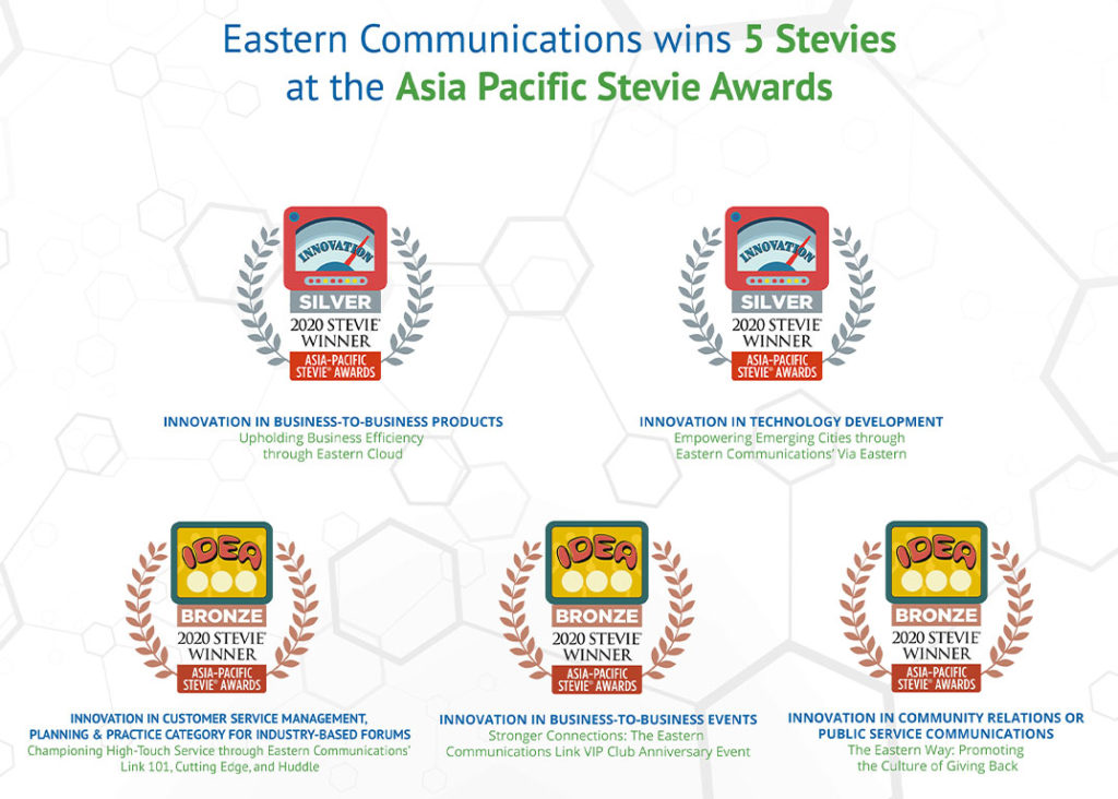 Last December 2020, Eastern Communications gained recognition for its commendable efforts highlighting its High Tech and High Touch promise which were utilized widely from customer service campaigns to COVID-19 response initiatives. The telco company took home Silver and Bronze awards in the seventh annual Asia-Pacific Stevie Awards in Singapore—the only business awards program to recognize innovation in the workplace in all 29 nations of the Asia-Pacific region.