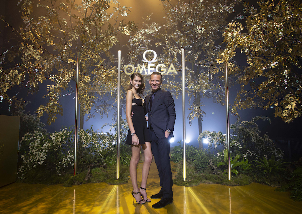 Kaia Gerber with Omega President Raynald Aeschlimann at the Trésor launch in Berlin