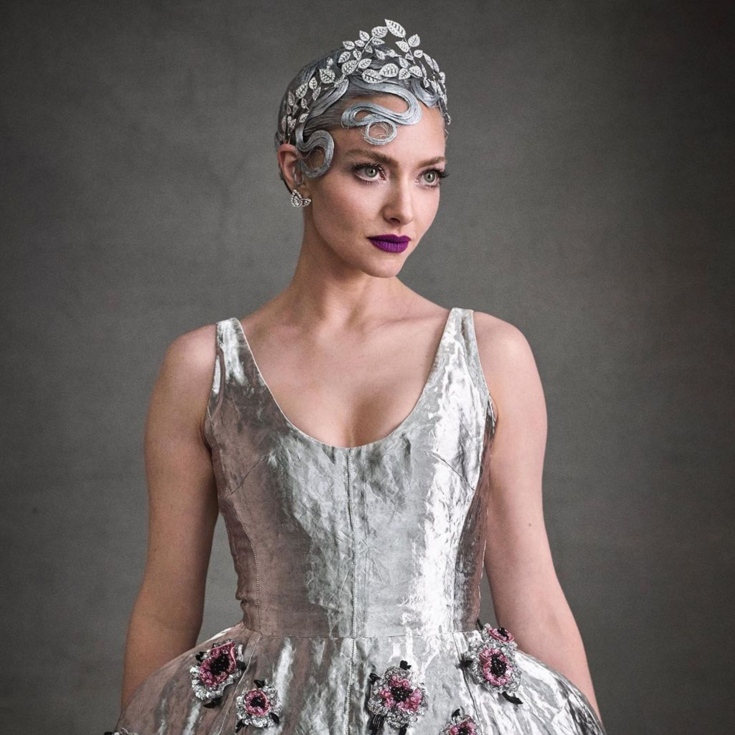 Amanda Seyfried paired her silvery updo with Chaumet’s Mélodie Nacrée tiara. She then wore the Josephine Duo Eternel earrings and Laurier and Joséphine Aigrette Impériale rings to complement the rest of her metallic look from Prada.