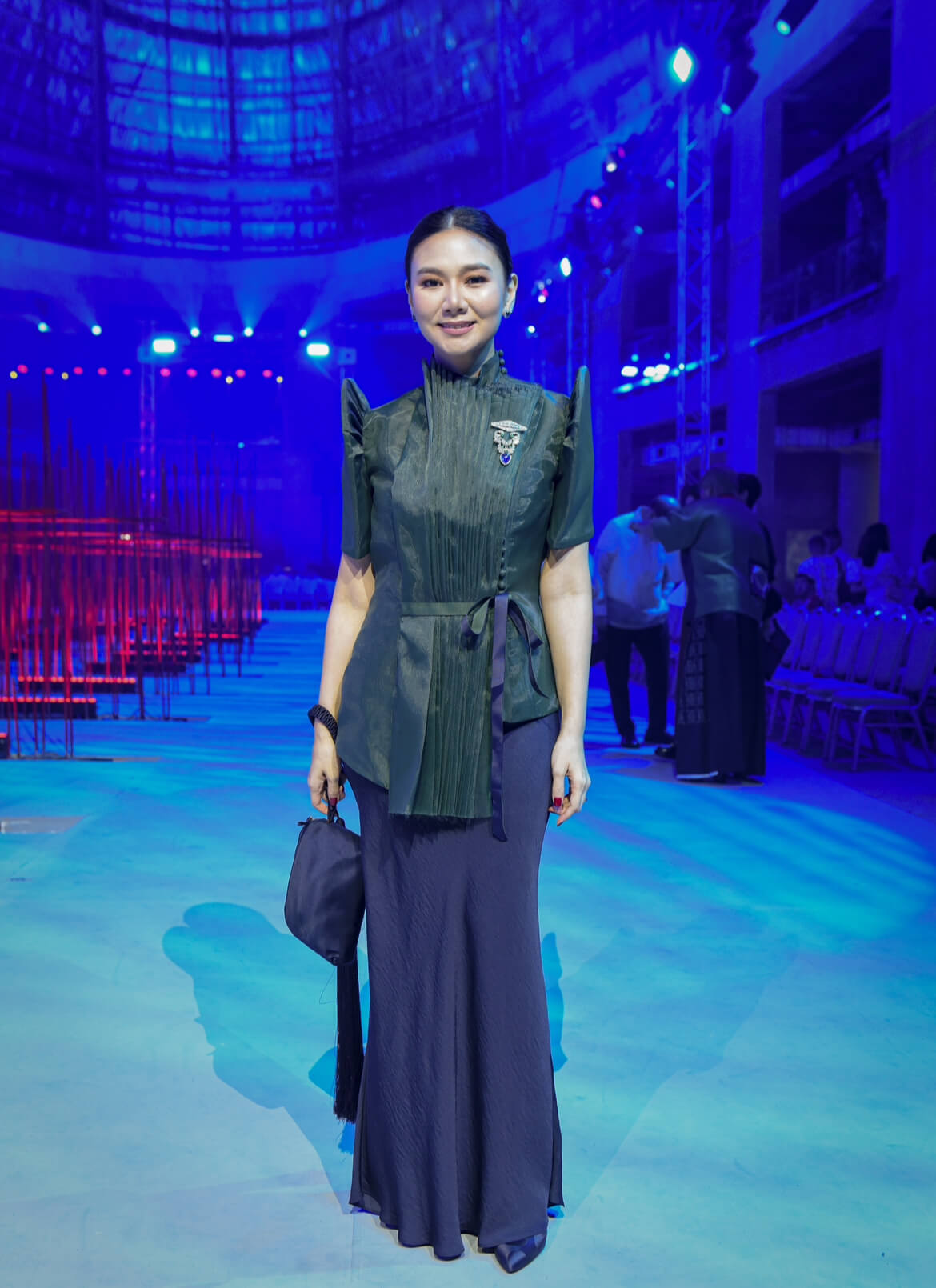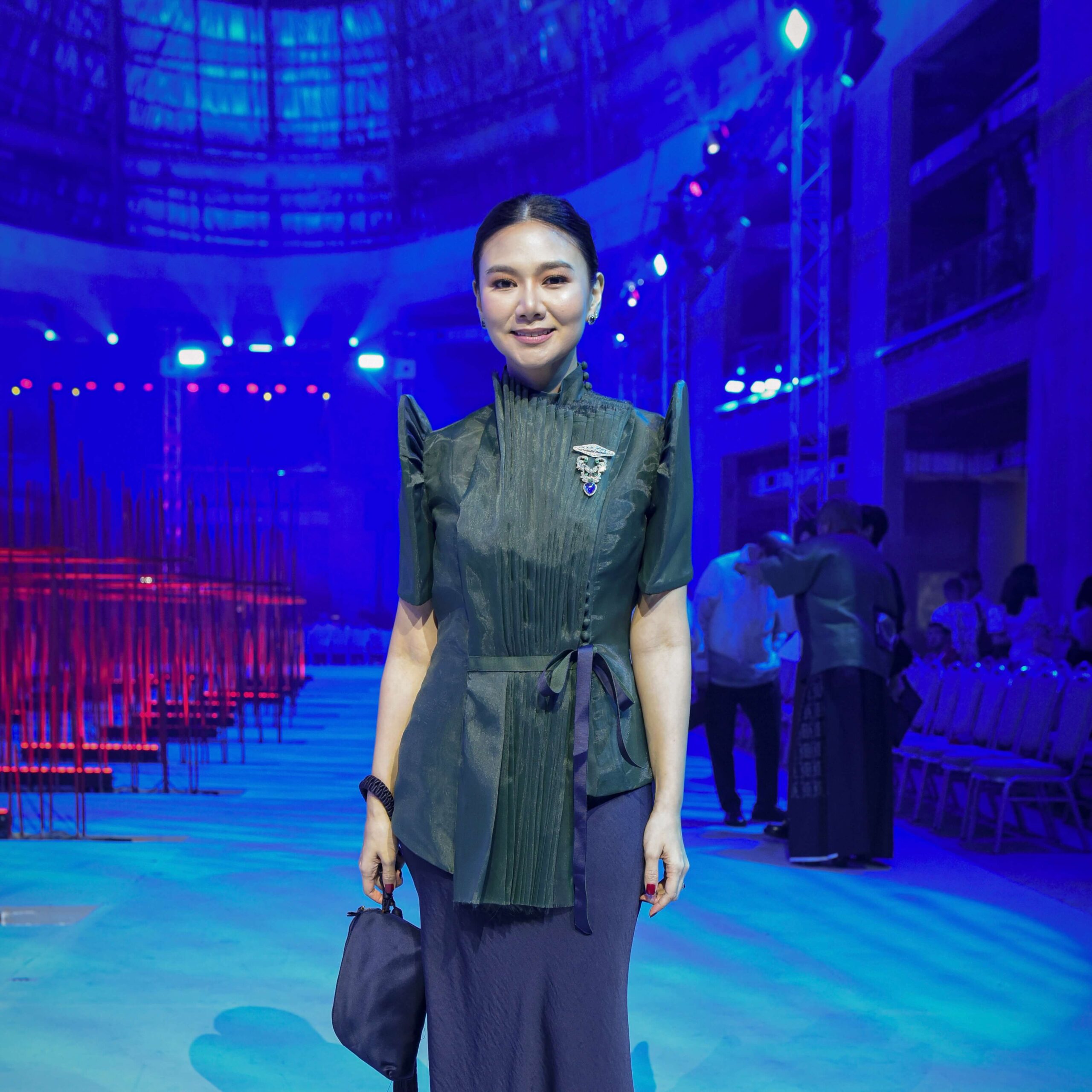 Lulu Tan Gan was a vision of harmony and craftsmanship. She wore a stunning TanGan Piña Jacket adorned with a beautifully beaded Sarimanok and a lovely brown embroidered scarf. She paired this with COS blue pants and eye-catching turquoise MiuMiu Footwear. The colors red, brown, and blue created a harmonious contrast, showing the elegance of her style.