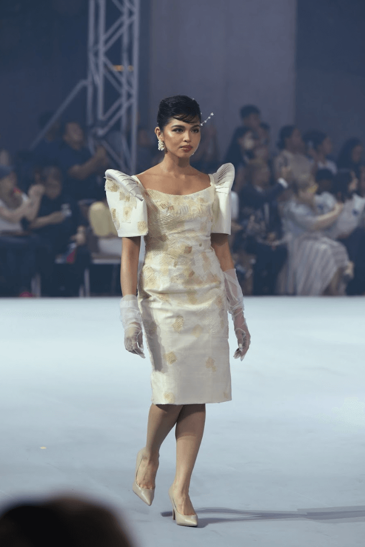 Ana De Ocampo, CEO of the Wildflour group of restaurants, stuns in a Jun Escario creation for Ternocon. Her white top, extending gracefully to her legs, is truly striking. The addition of a ribbon infuses a youthful yet elegant touch, perfectly complementing her style.