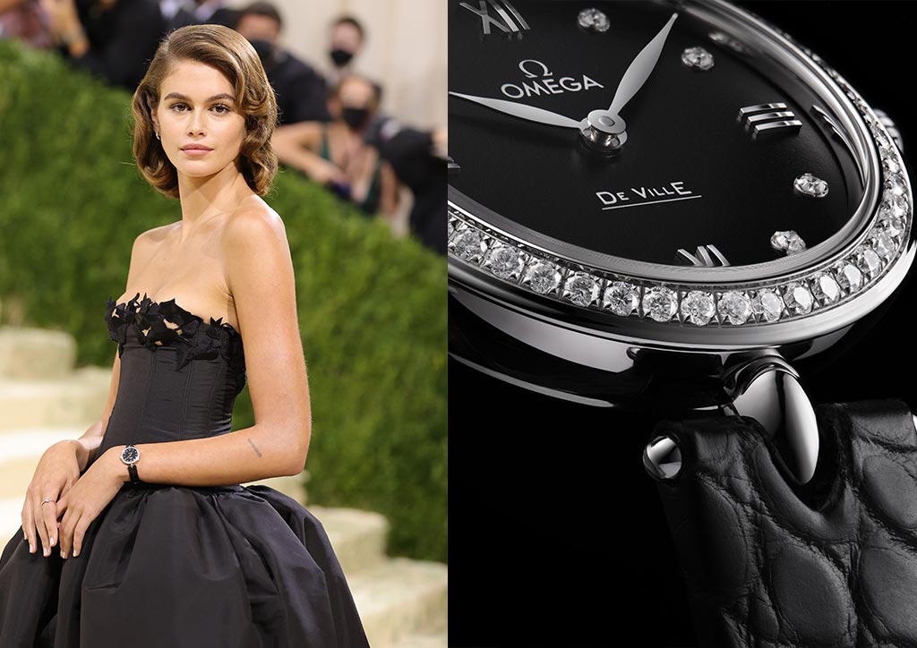 Kaia Gerber, who is part of the OMEGA family alongside her mother Cindy Crawford, was wearing a dress by Oscar de la Renta and coupled her look with a De Ville Prestige timepiece in stainless steel.