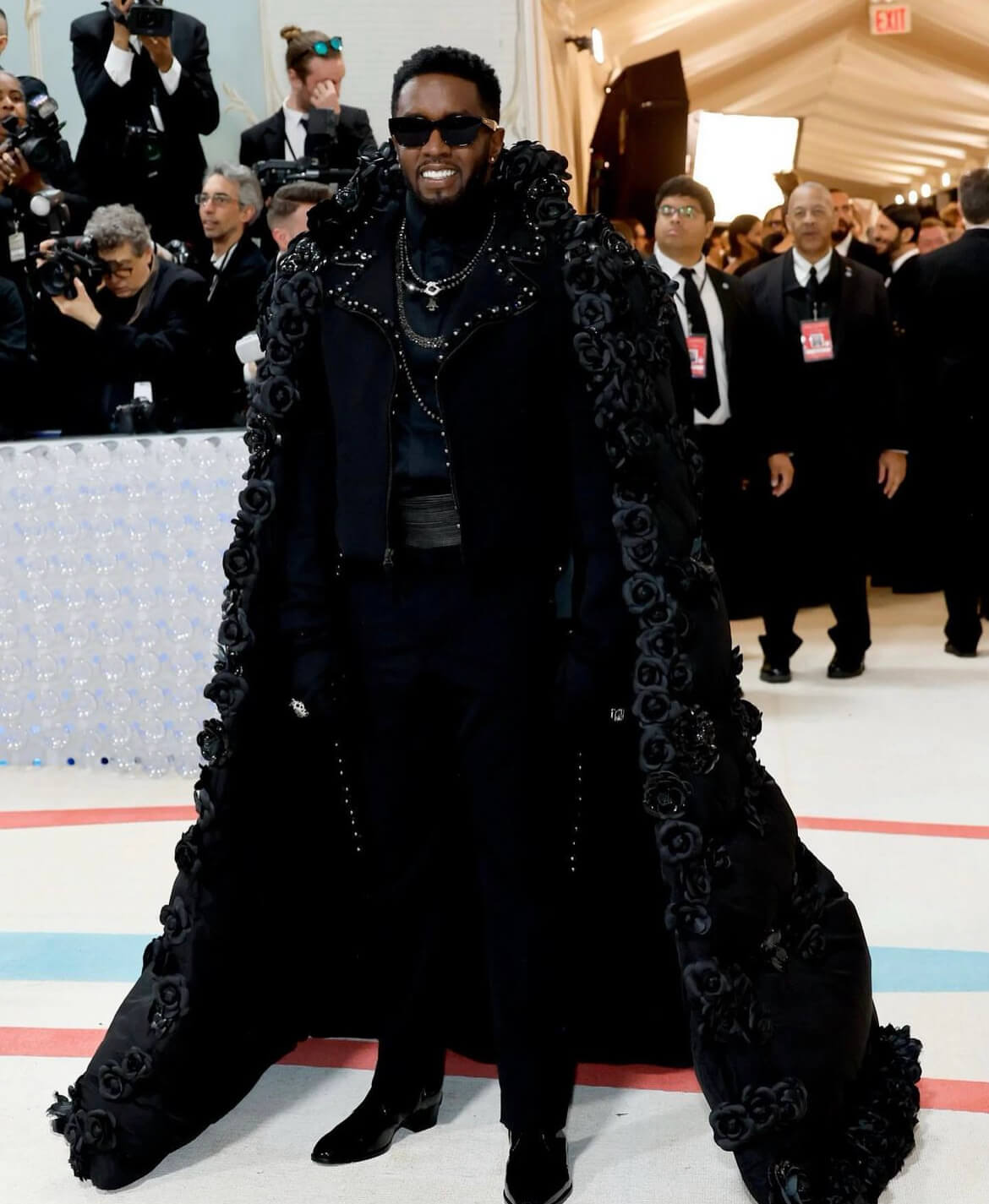 Together with Yung Miami as his date. He wore all black including a cape. “Tonight I honor the greats, Karl Lagerfeld & André Leon Talley. Embracing Karl’s love for pearls and camellias, this look is a tribute to their legendary impact on fashion,” Diddy shared in an Instagram post.