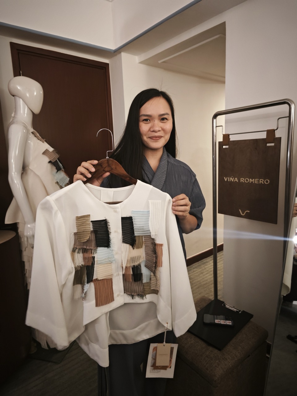 Viña Romero and her pin-tucked modern barongs / Photo by the author