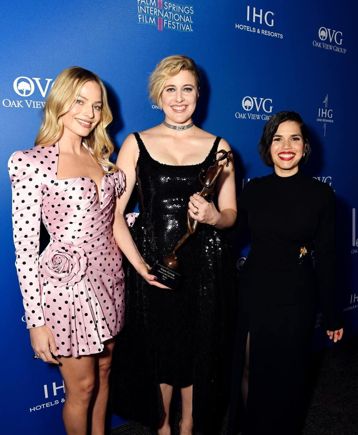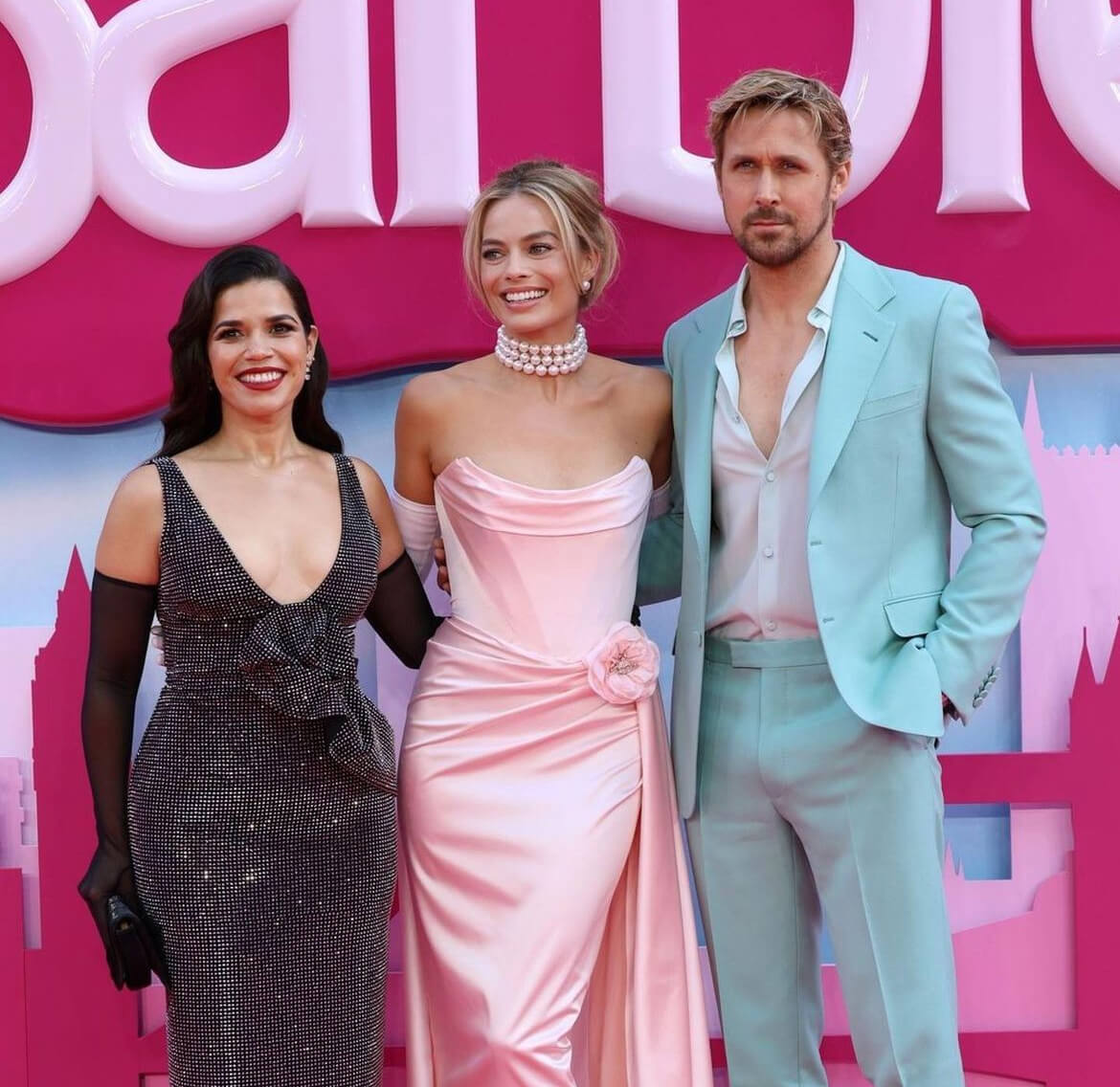 Towards the end, Gosling descended the stage and passed the mic to his Barbie family: Greta Gerwig, Margot Robbie, and America Ferrera.