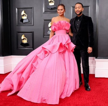 Chrissy Teigen wore a pink princess-like Nicole + Felicia Couture dress. While her husband, previous multi-Grammy winner John Legend kept it lowkey in a tailored Zenga suit. During the show, Legend performed his song FREE in tribute to Ukraine.