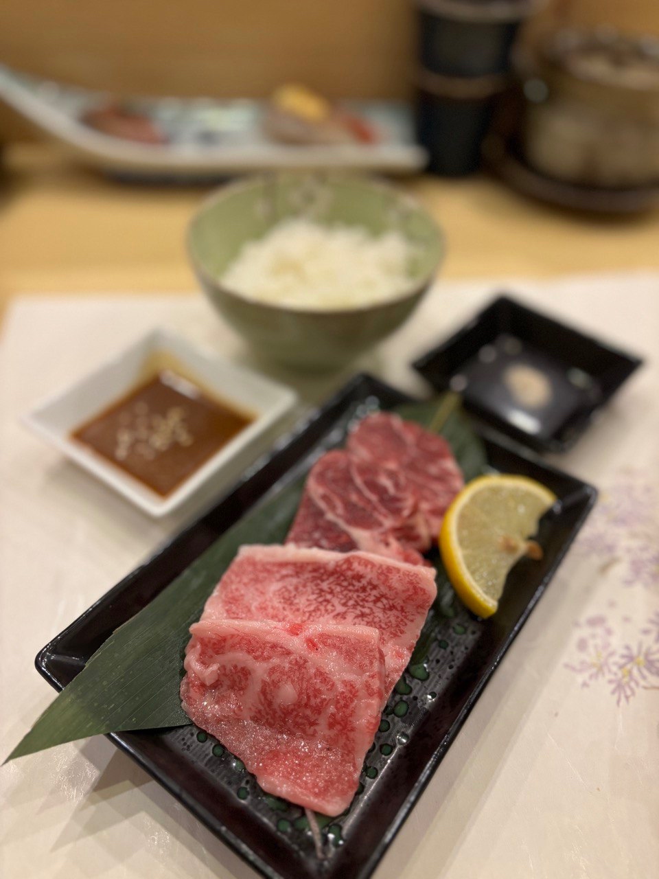 Kushiyaki (Bacon Mochi, Tsukune), Tempura Moriawase (Shrimp, Chicken, Eggplant), Angus and Wagyu Yakiniku, Japanese Rice
