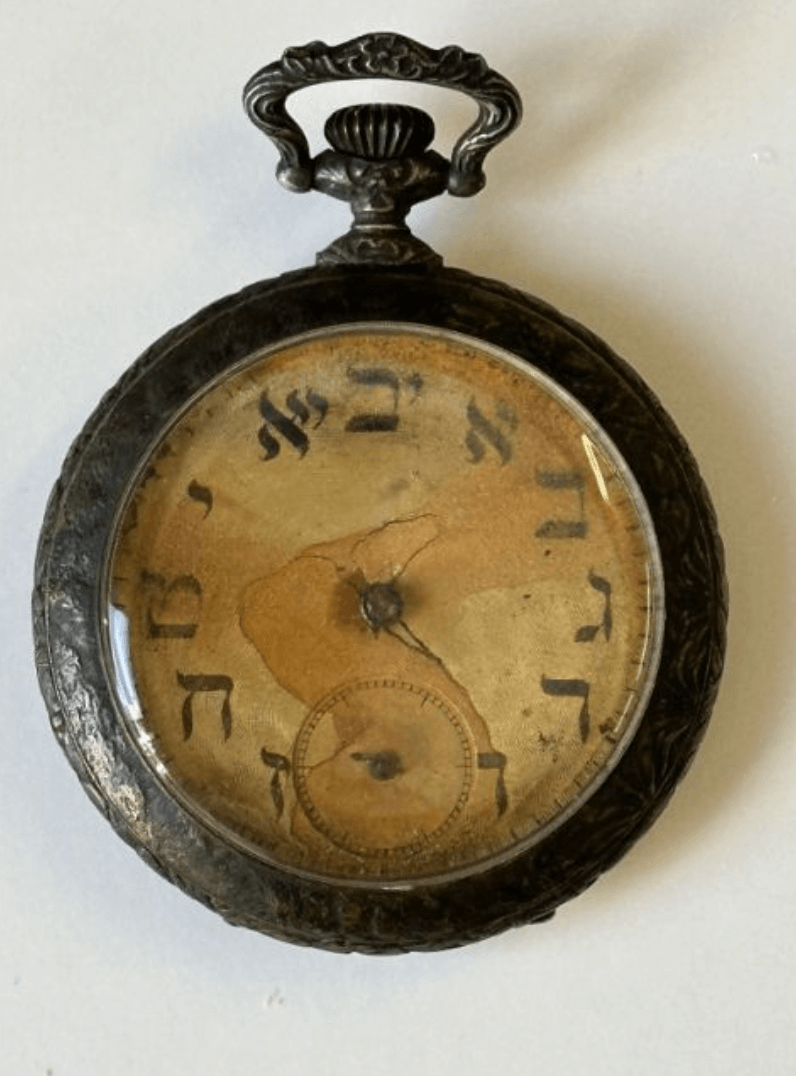 The Swiss-made watch shows signs of heavy corrosion from the Atlantic’s saltwater. The Hebrew figures on its stained face remain visible.