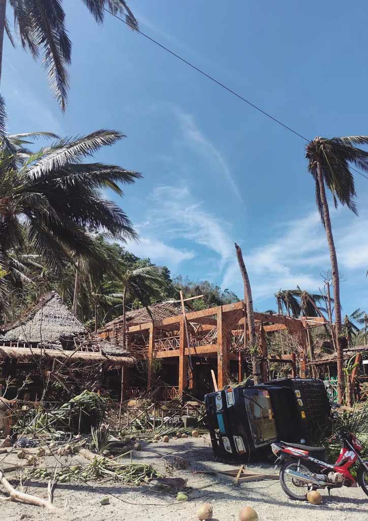 “Plywood we used to board up the facade facing the ocean flew apart,” he continues. “We had expected a storm surge and were ready to go to the third floor, but we were lucky that it did not happen in our area in Catangnan… and the third floor did not offer protection from the strength of the wind.”