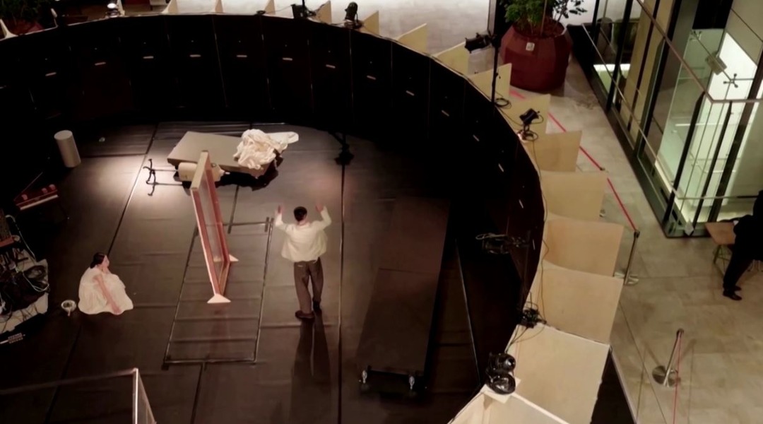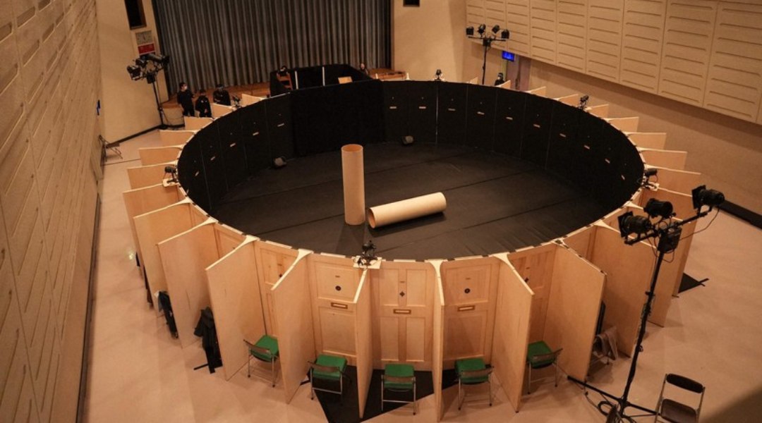 Thirty cubicles separated by dividers surround the circular stage. Each cubicle has a closed-door made of plywood and a mailbox slot that allows each audience member to watch the show. The theater group ensures the holes are wide enough to keep a sufficient field of view despite the obvious limitation.