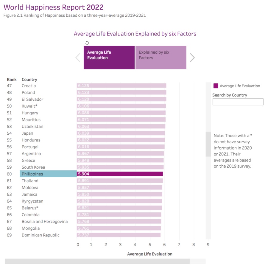 In 2021, the Philippines ranked one sport lower at 61st place. The 2022 report’s overview says that “the most remarkable change seen during COVID-19 has been the global upsurge in benevolence in 2021. This benevolence has provided notable support for the life evaluations of givers, receivers, and observers, who have been gratified to see their community’s readiness to reach out to help each other in times of need.”