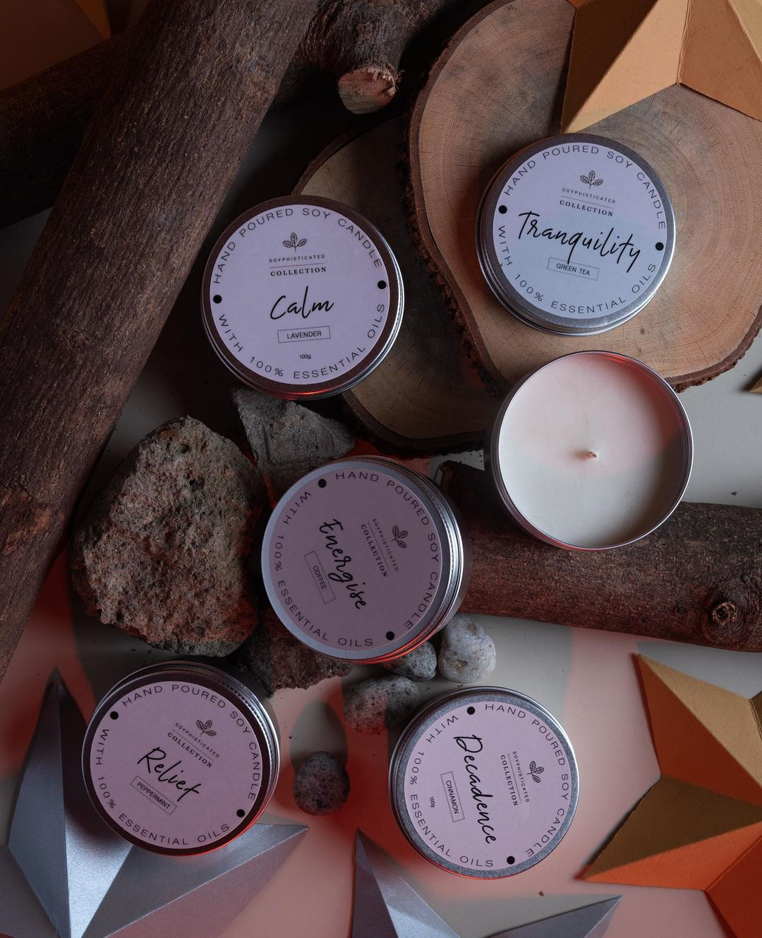 Some of their scented candles include Calm (lavender), Relief (peppermint), Radiance (fresh bamboo), tranquility (green tea), Romance (hibiscus), Peace (white jasmine), Comfort (bergamot), and Indulge (vanilla). Customers have a choice of candles in 100 gram tin cans or 250 gram glass jars, both of which have an understated yet elegant look to them.